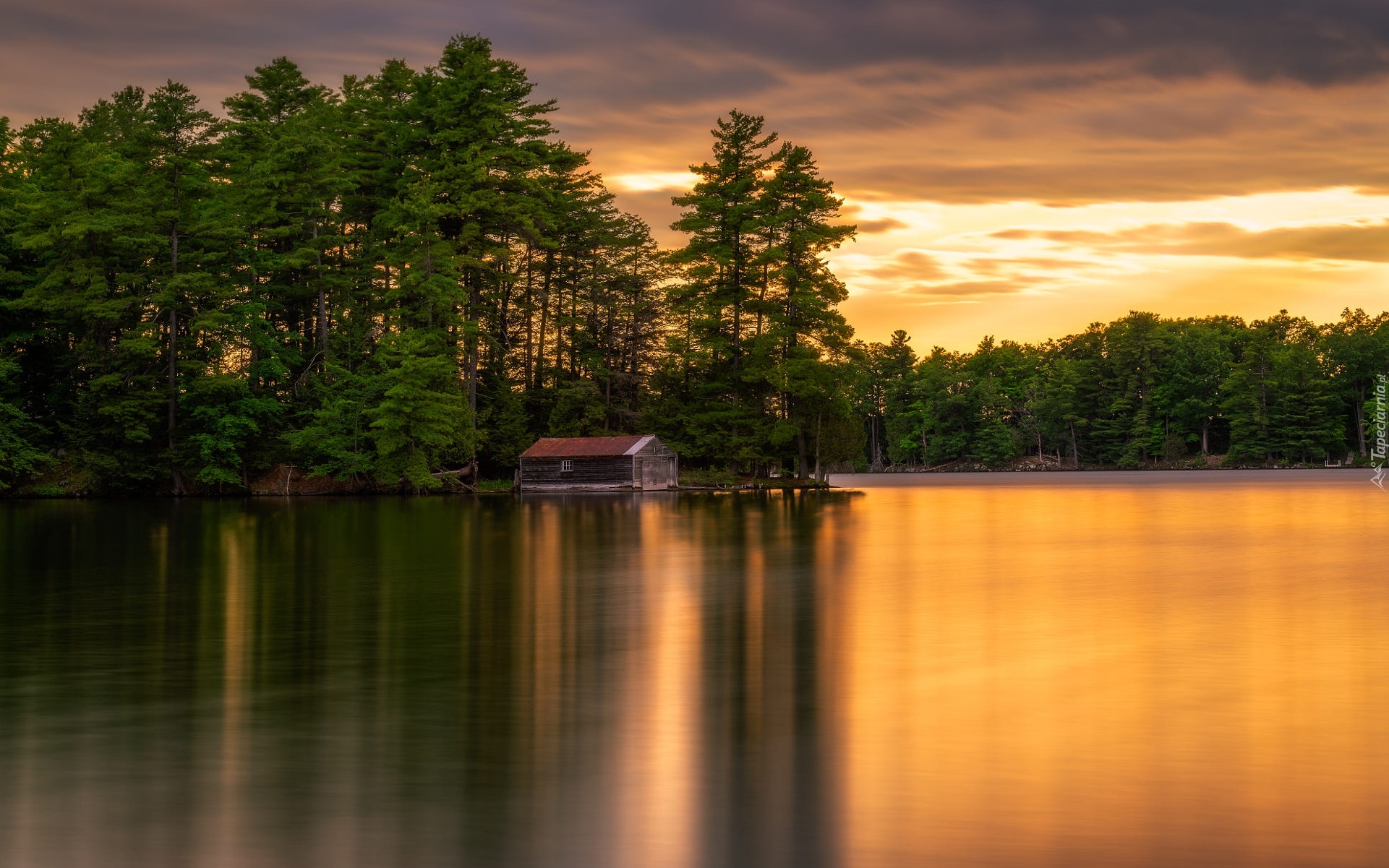 Edytor tapety: Drewniany dom pośród drzew nad jeziorem