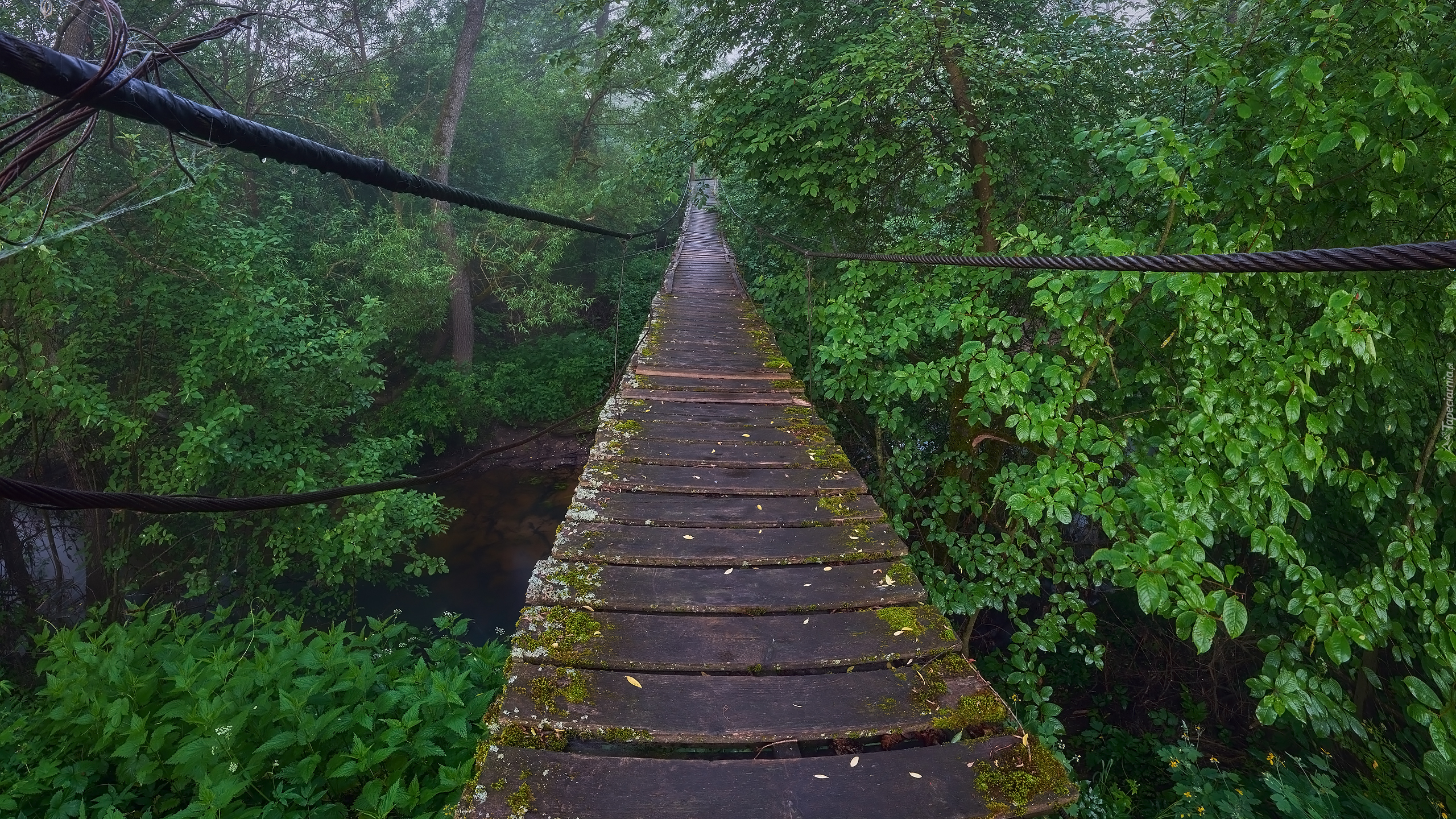 Edytor tapety: Otoczony drzewami drewniany most wiszący nad rzeką