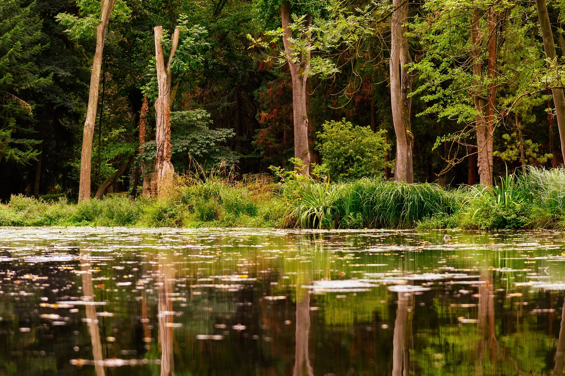Edytor tapety: Trawy i zielony las nad jeziorem