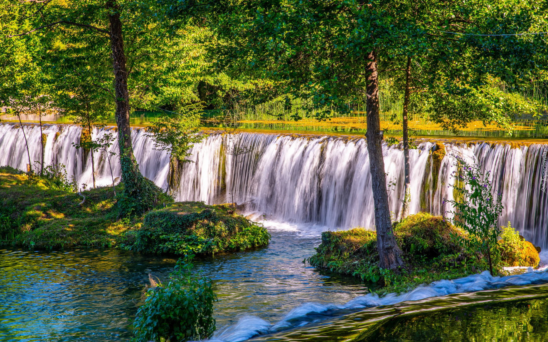 Edytor tapety: Wodospad wpadający do rzeki w zielonym lesie