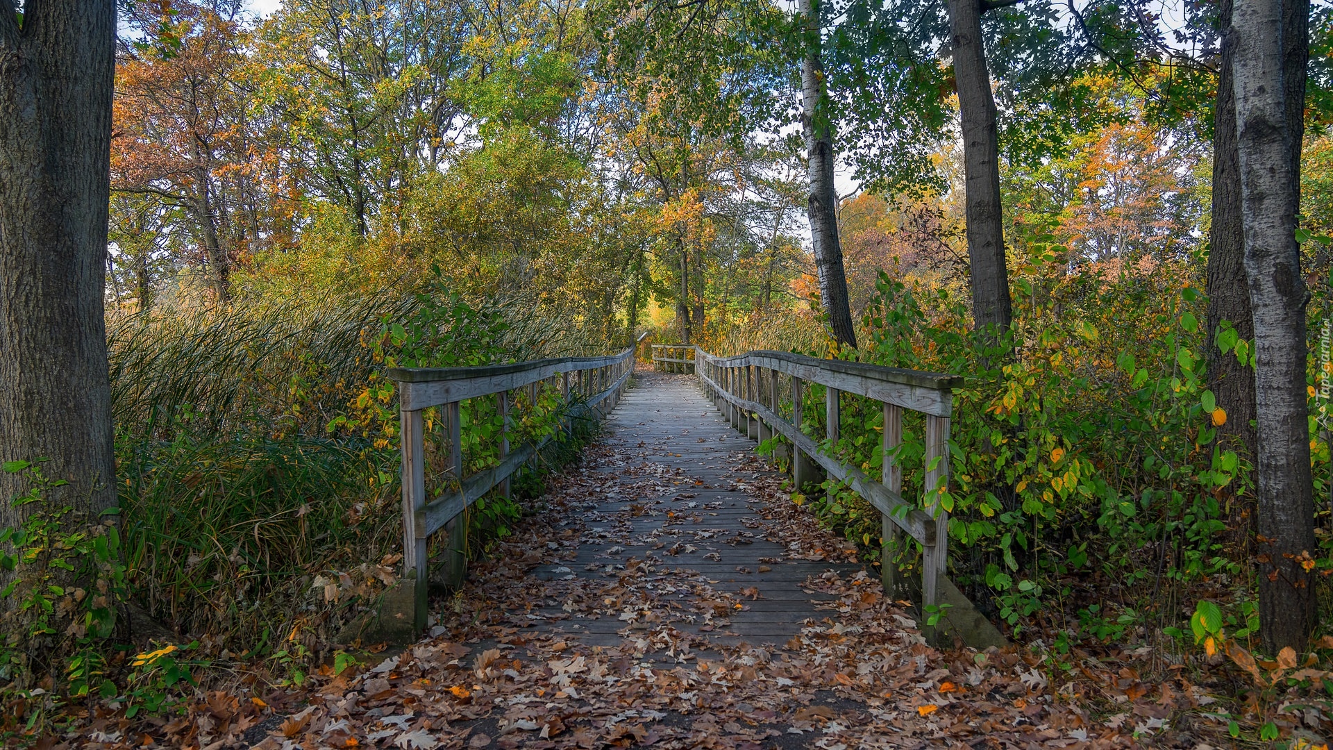 Edytor tapety: Jesienne drzewa przy drewnianym mostku