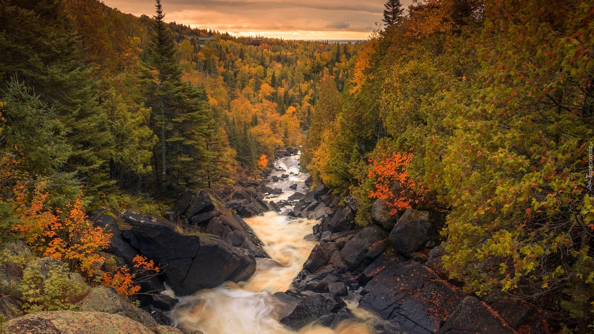 Edytor tapety: Jesienne drzewa na skałach nad rzeką Poplar River