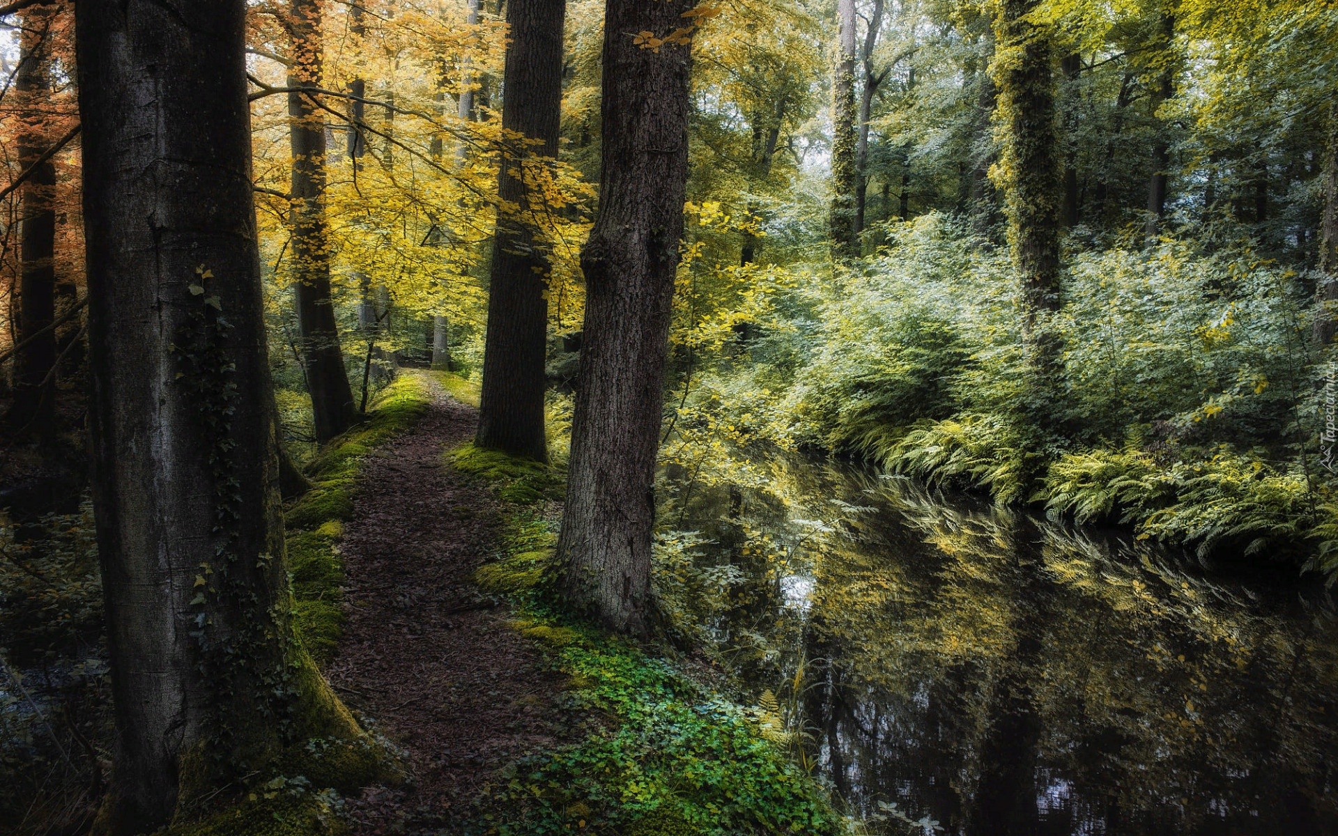 Edytor tapety: Wysokie drzewa przy ścieżce obok leśnego strumienia