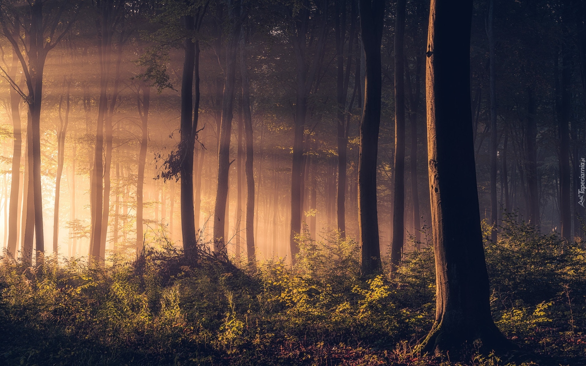 Edytor tapety: Krzewy pod drzewami w słonecznych promieniach