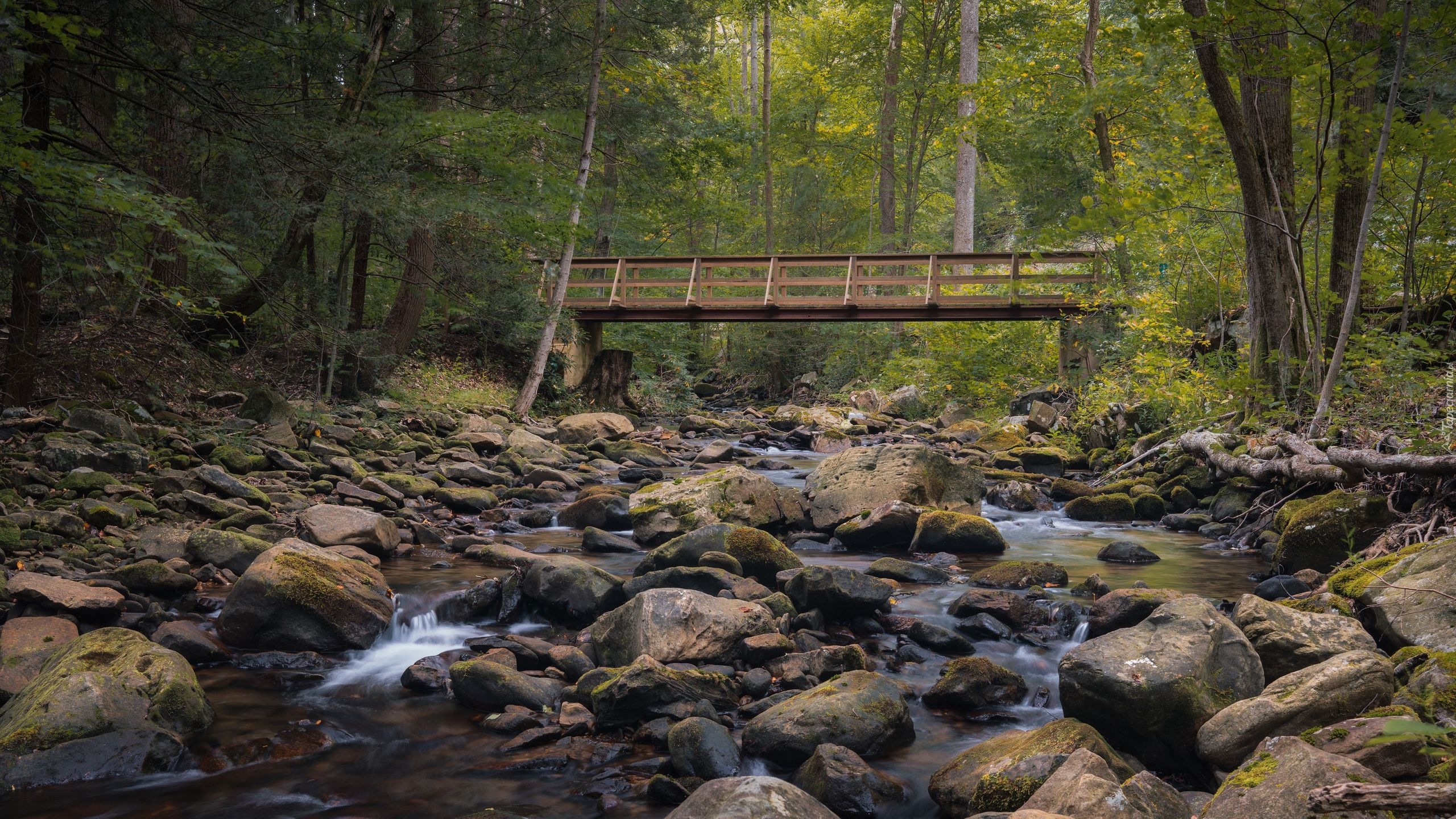 Edytor tapety: Most nad kamienistym strumieniem w lesie