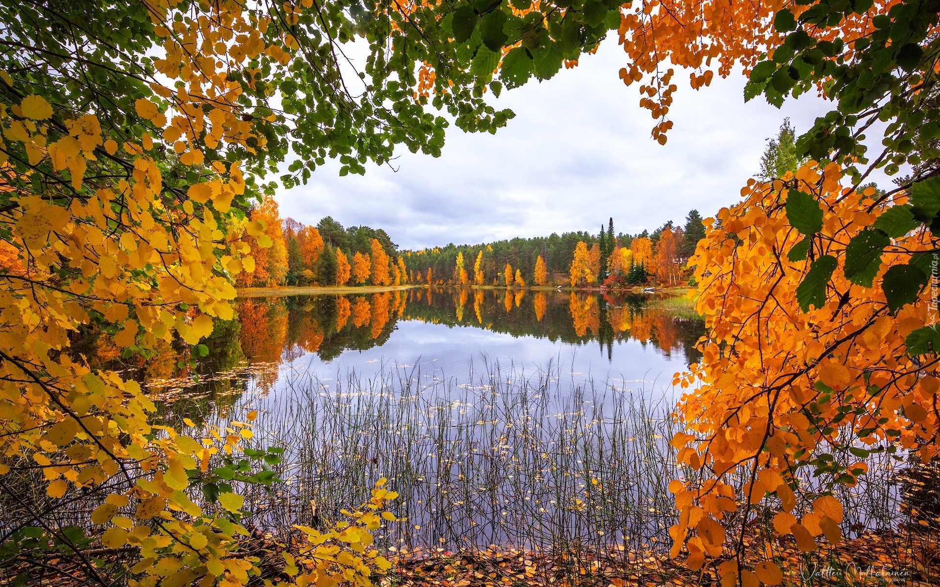 Edytor tapety: Pożółkłe drzewa wokół jeziora