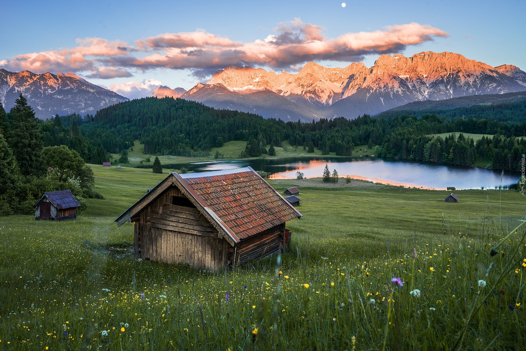 Edytor tapety: Szopy w pobliżu jeziora Geroldsee i Góry Karwendel
