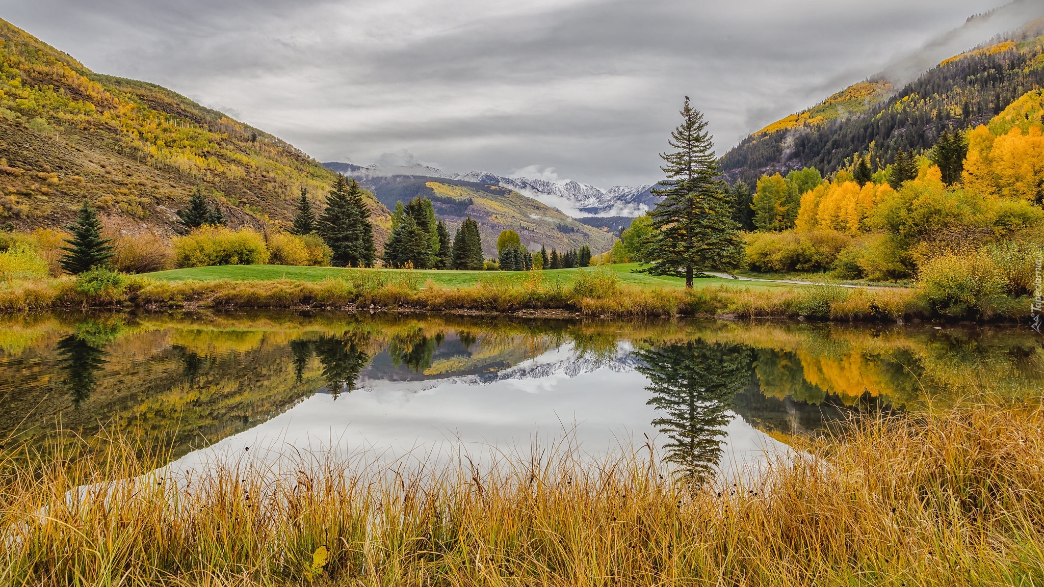 Edytor tapety: Jesienne drzewa i rośliny wokół stawu