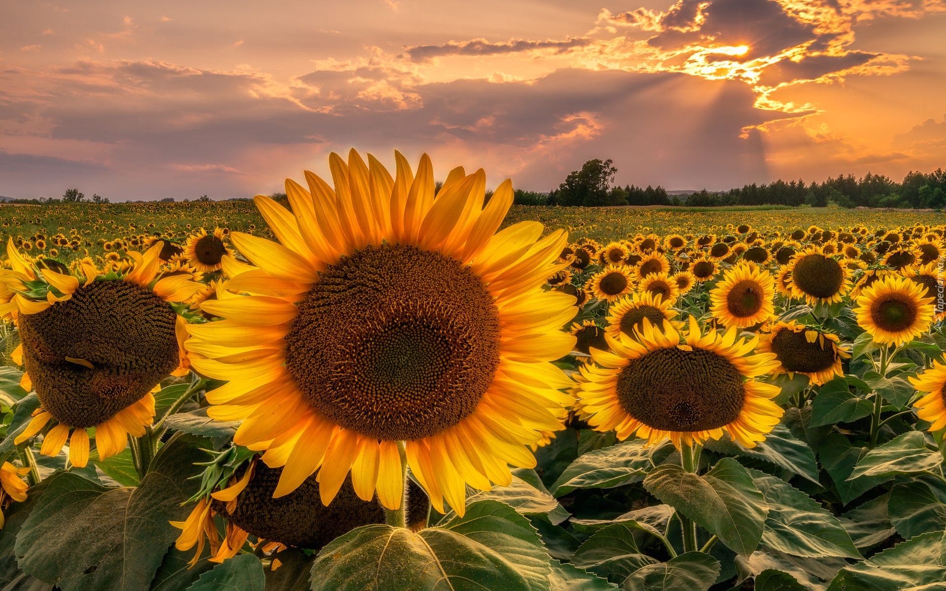 Edytor tapety: Chmury nad polem kwitnących słoneczników