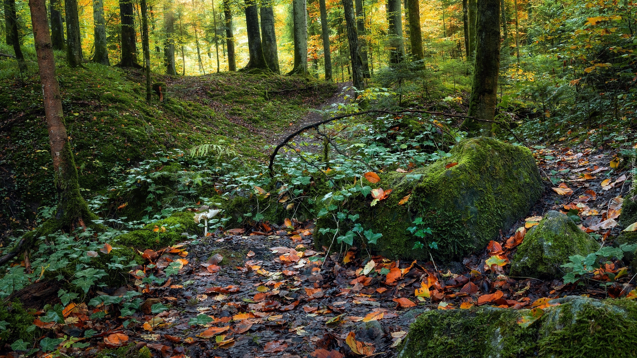 Edytor tapety: Opadłe liście i omszałe kamienie w lesie
