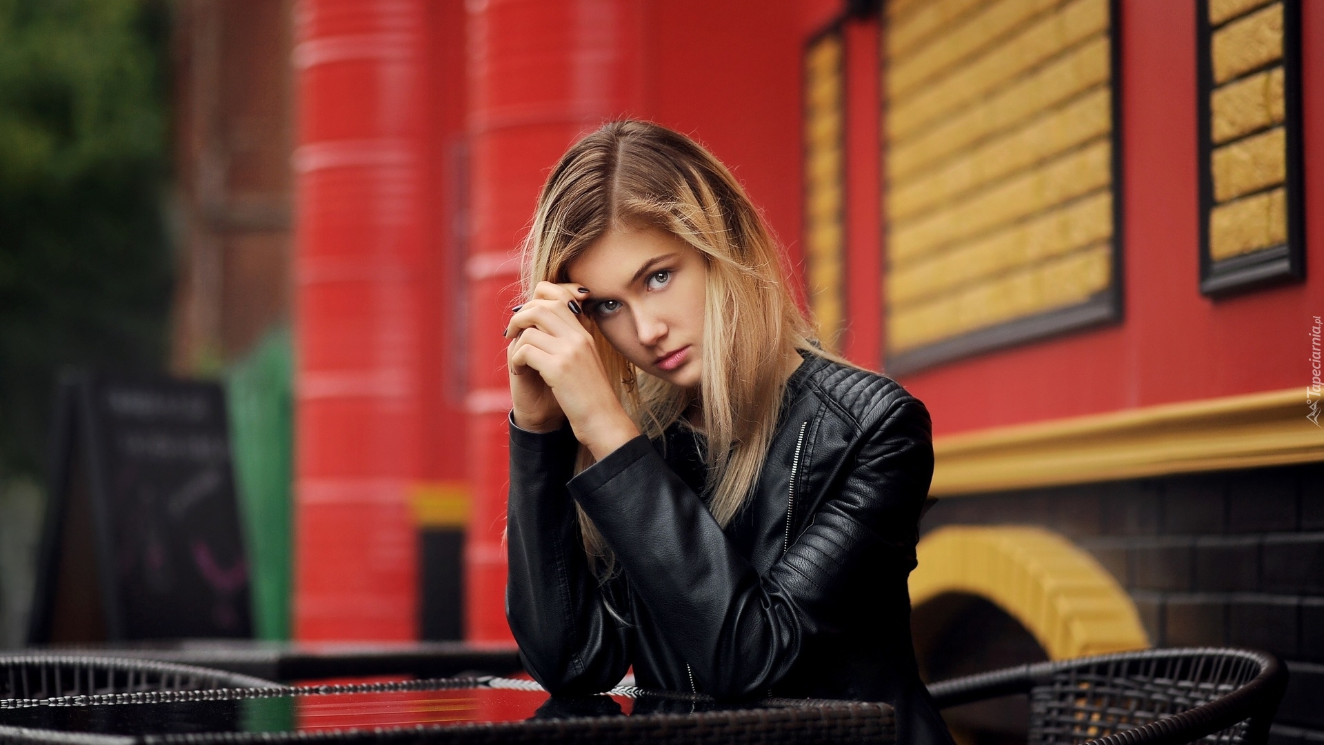 Edytor tapety: Dziewczyna w skórzanej kurtce przy stoliku