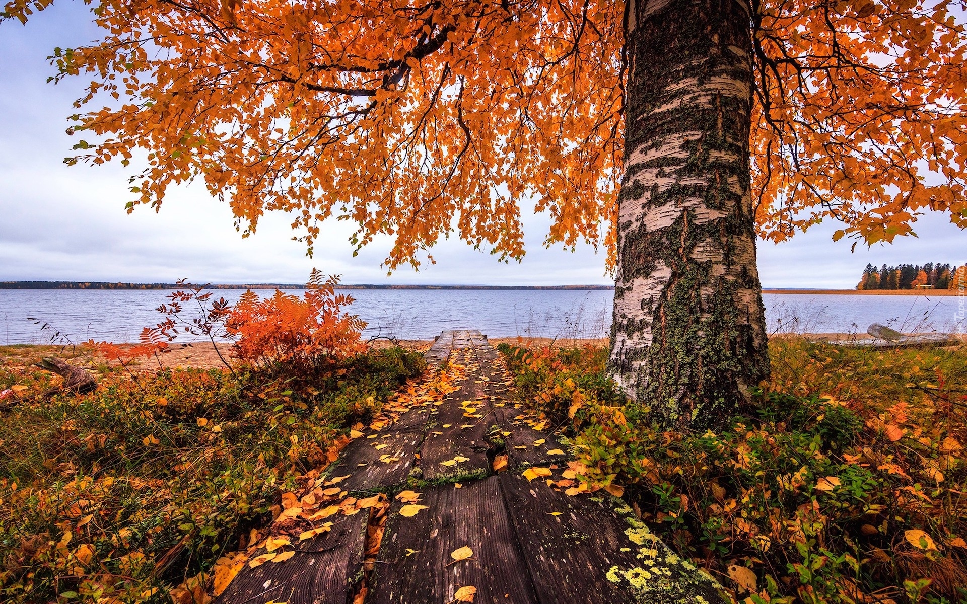 Edytor tapety: Drewniana kładka pod brzozą nad jeziorem jesienią