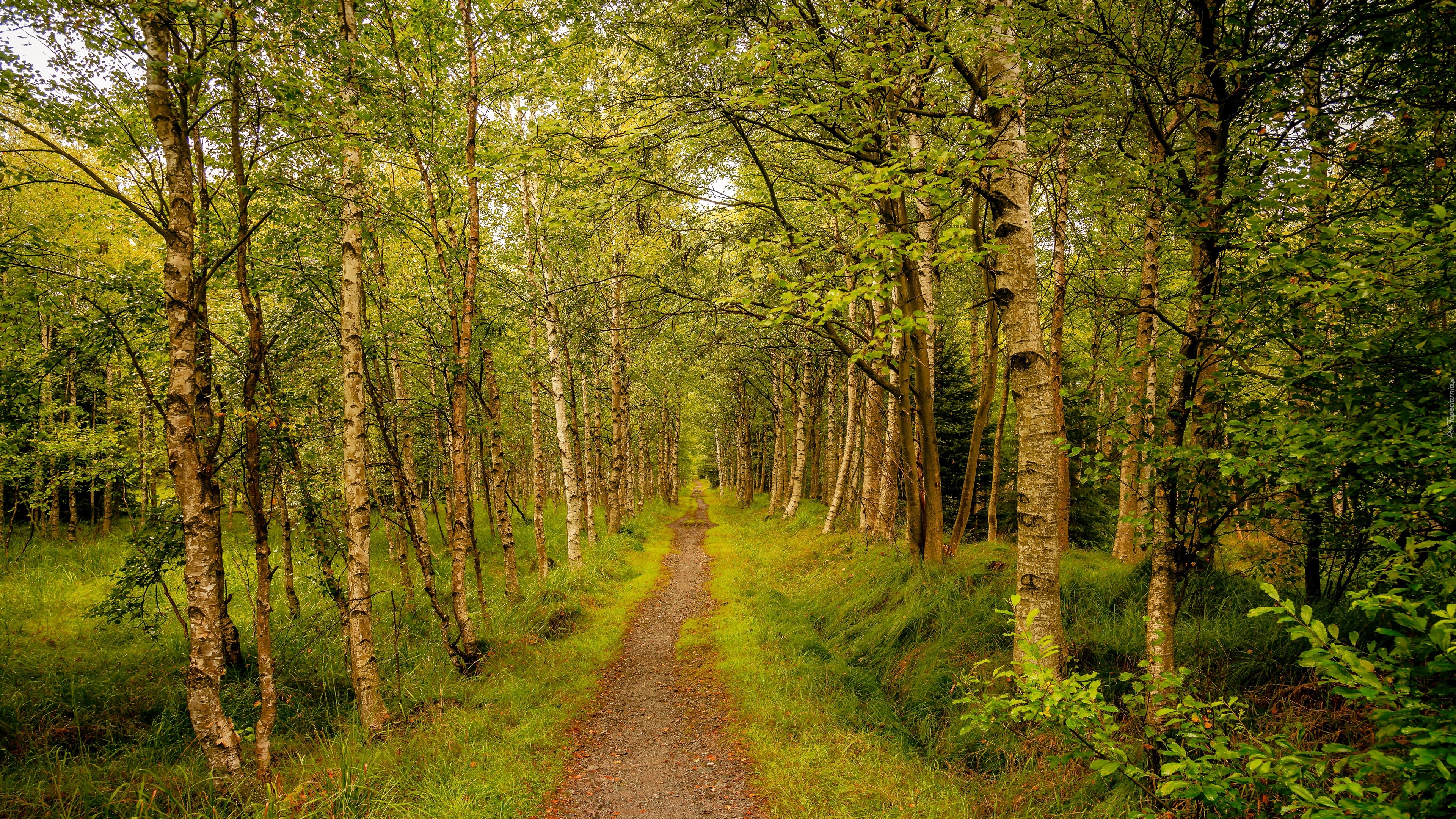 Edytor tapety: Ścieżka pośród brzóz w zielonym lesie