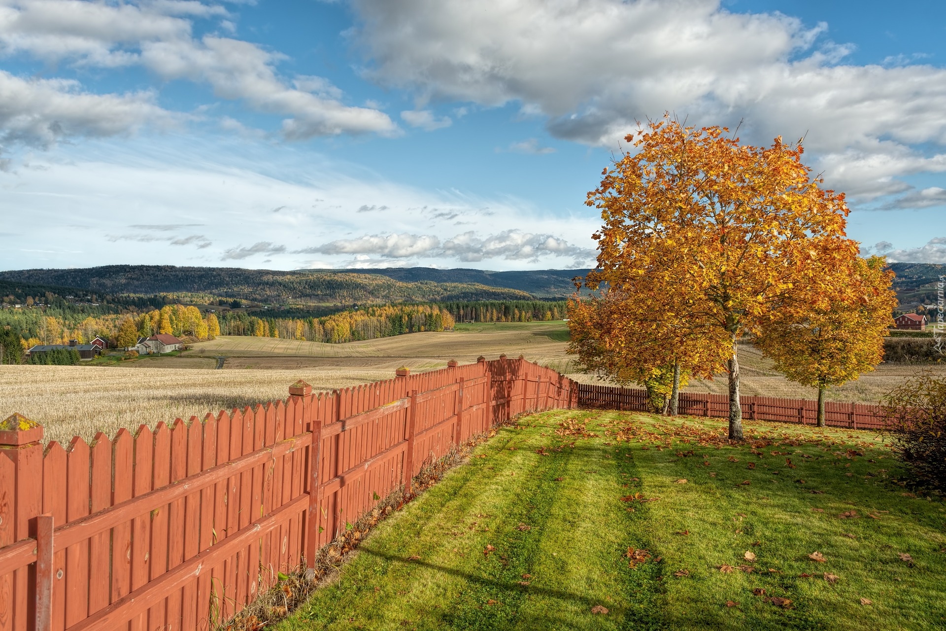 Edytor tapety: Jesienne drzewo przy płocie i pola w oddali