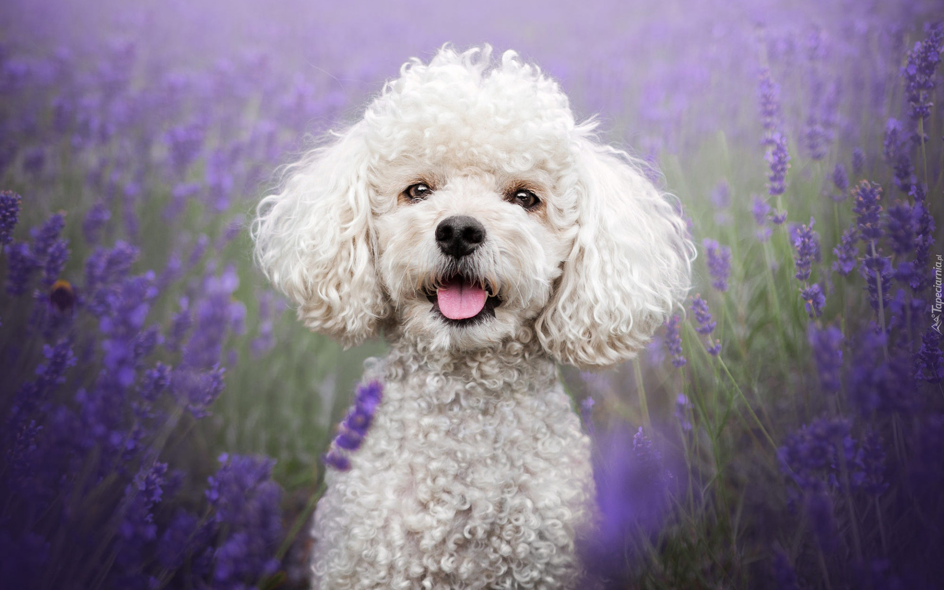 Edytor tapety: Biały pudel wśród lawendy