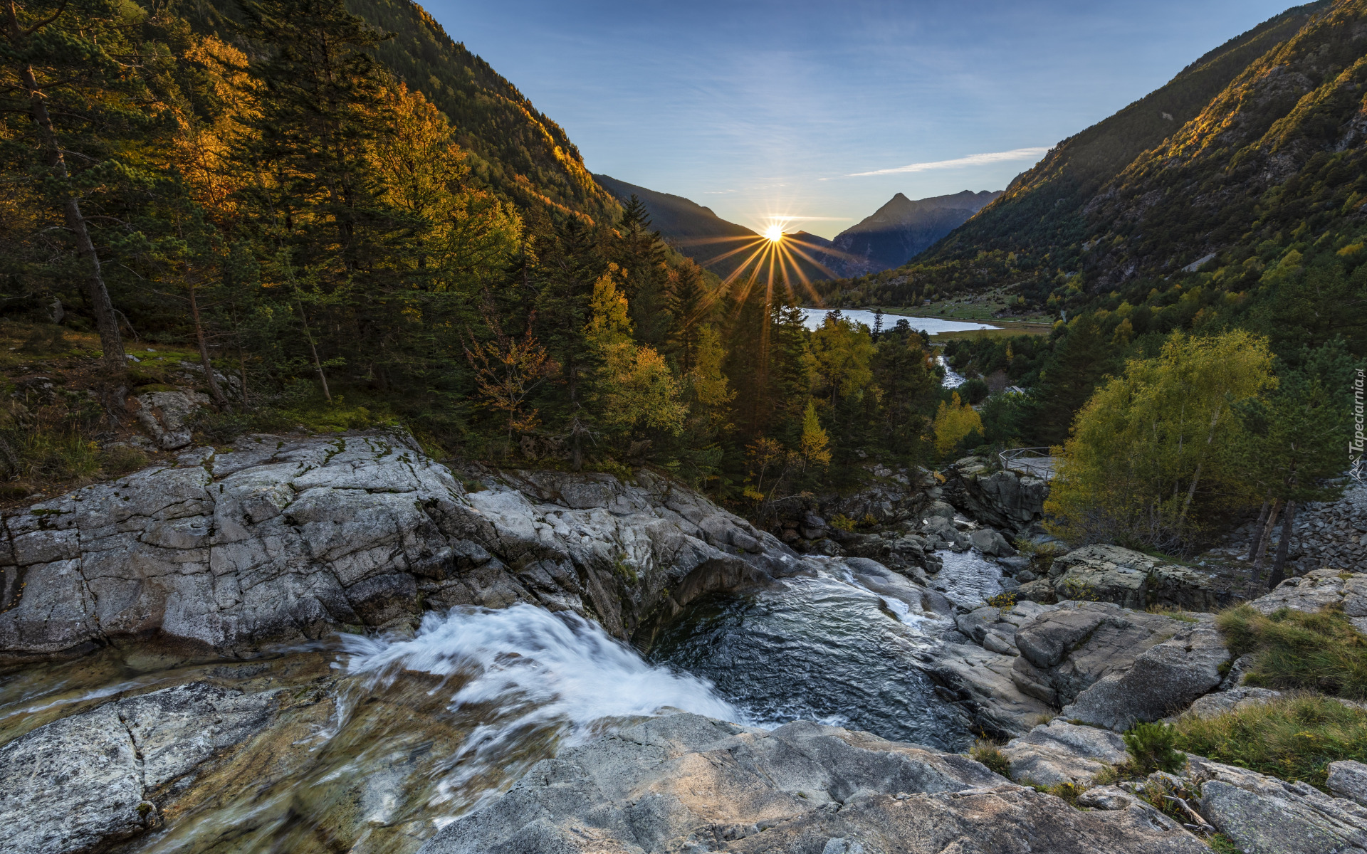 Edytor tapety: Strumień na skale i góry w tle
