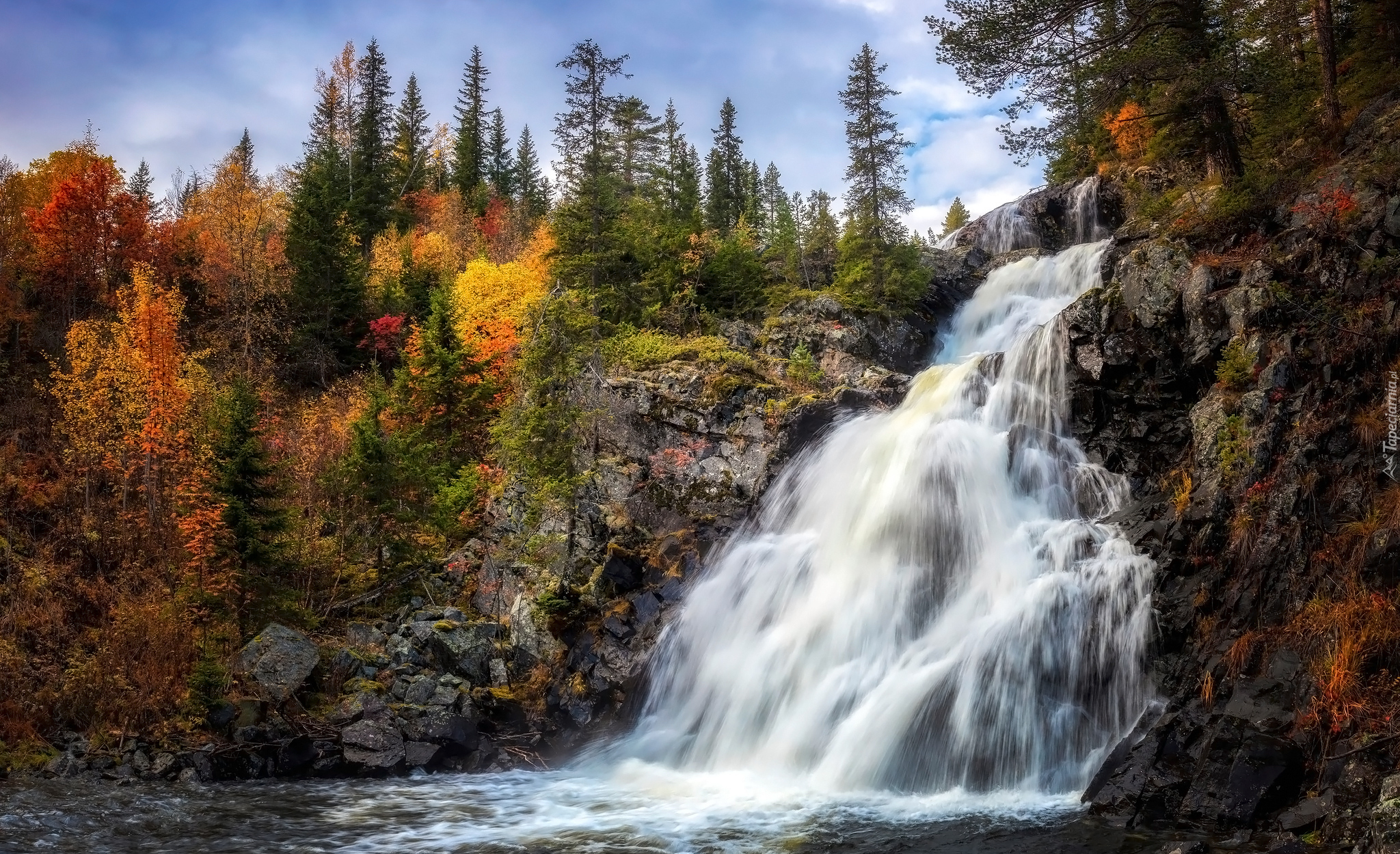 Edytor tapety: Jesienne drzewa na skałach przy wodospadzie i rzece