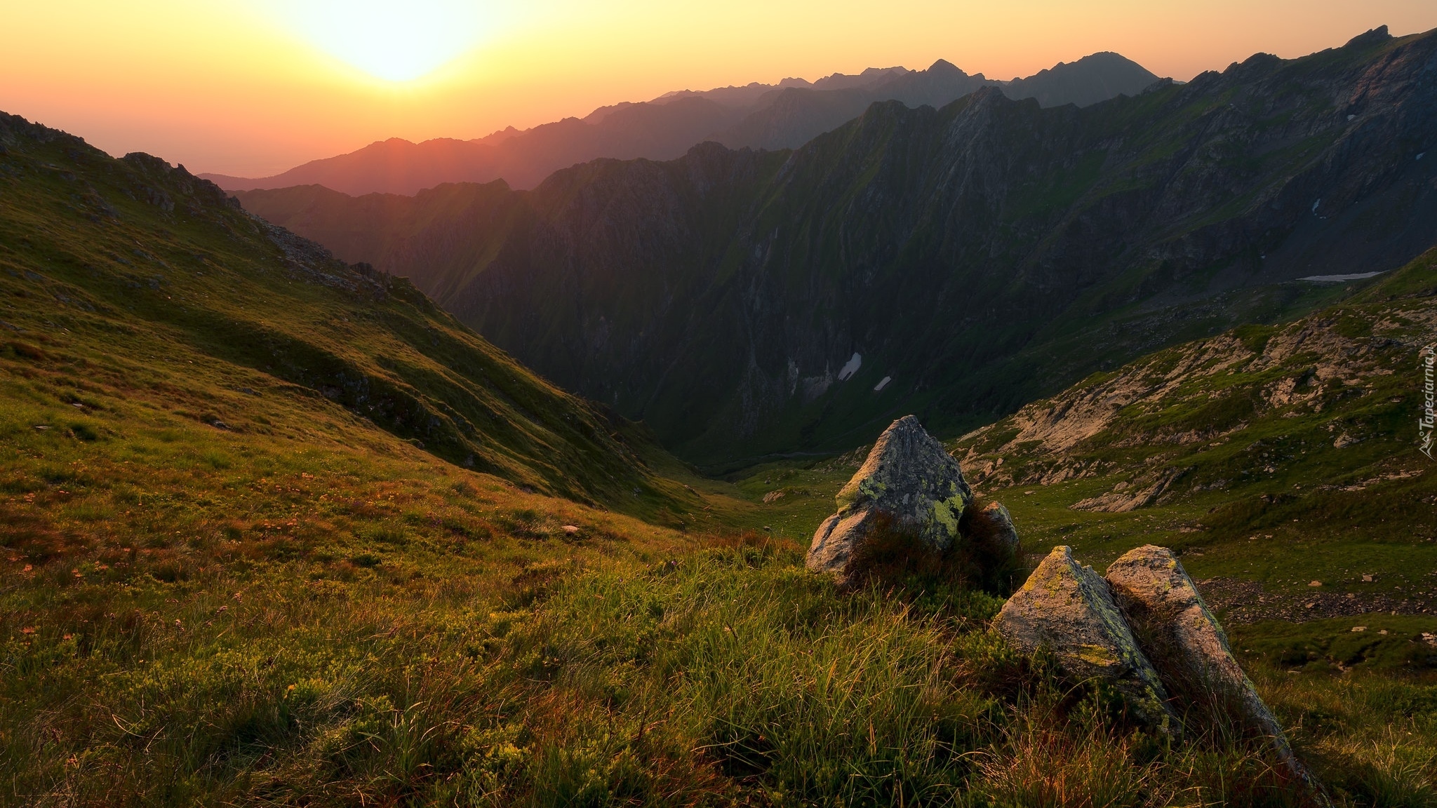 Edytor tapety: Rozświetlona słońcem górska dolina