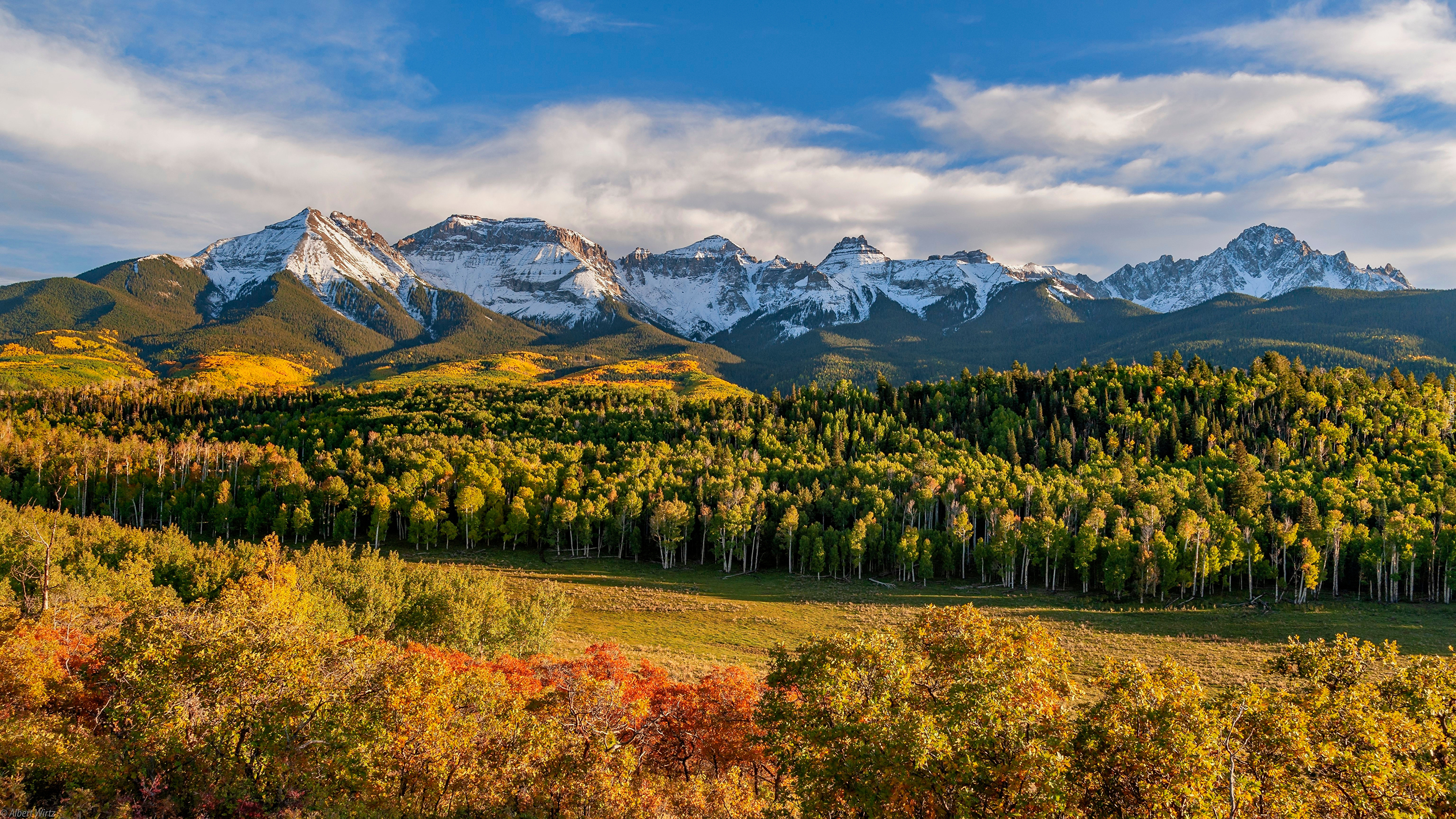 Edytor tapety: Pożółkłe drzewa i krzewy na tle ośnieżonych gór
