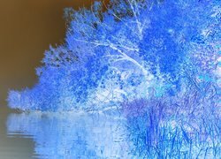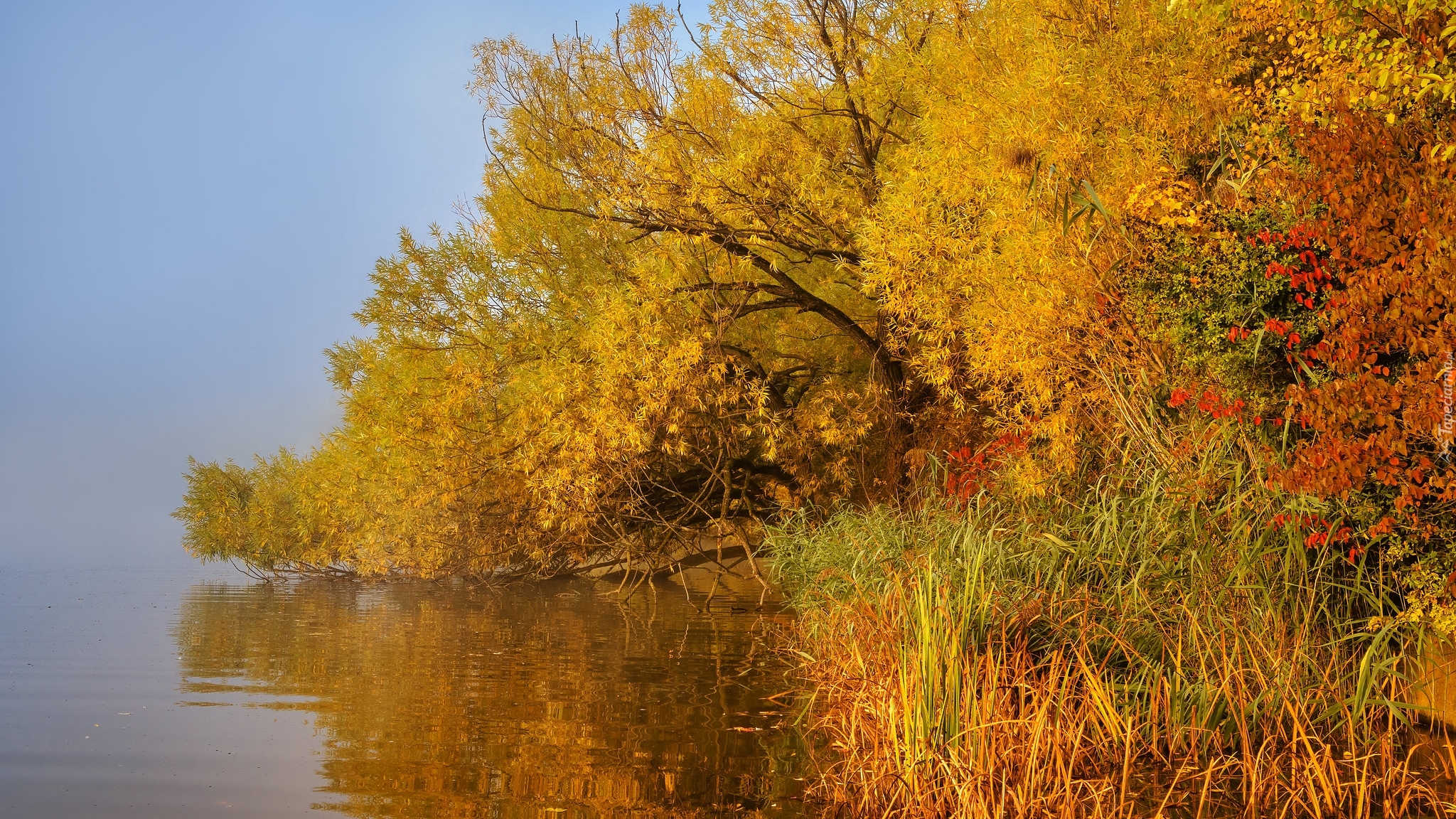 Edytor tapety: Jesienne drzewa na brzegu zamglonej rzeki