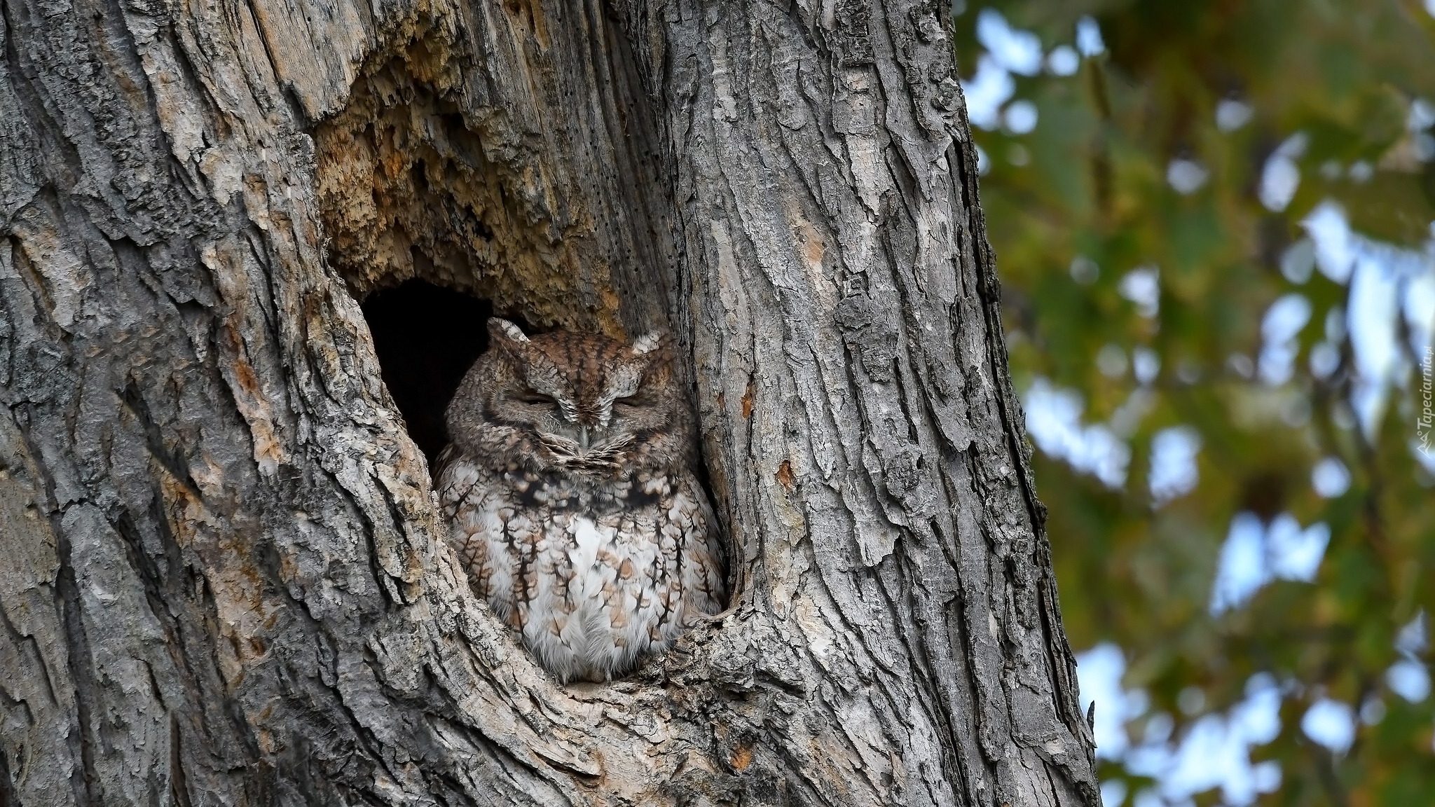 Edytor tapety: Śpiący syczoń krzykliwy w dziupli