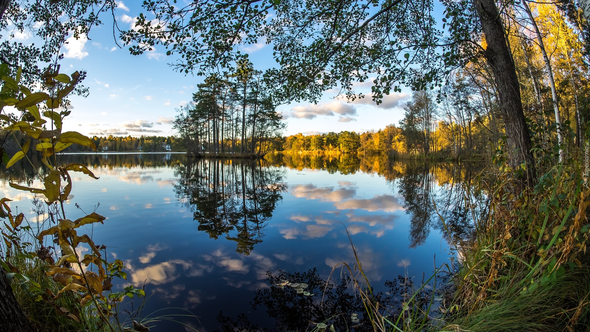 Edytor tapety: Drzewa na brzegu jeziora jesienną porą