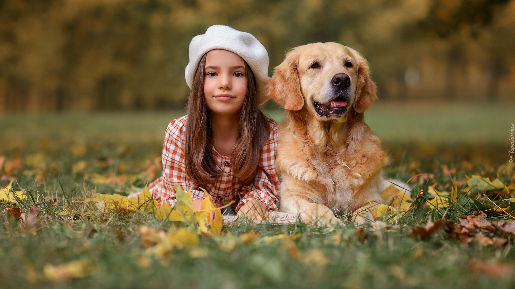 Edytor tapety: Dziewczynka w białym berecie i golden retriever