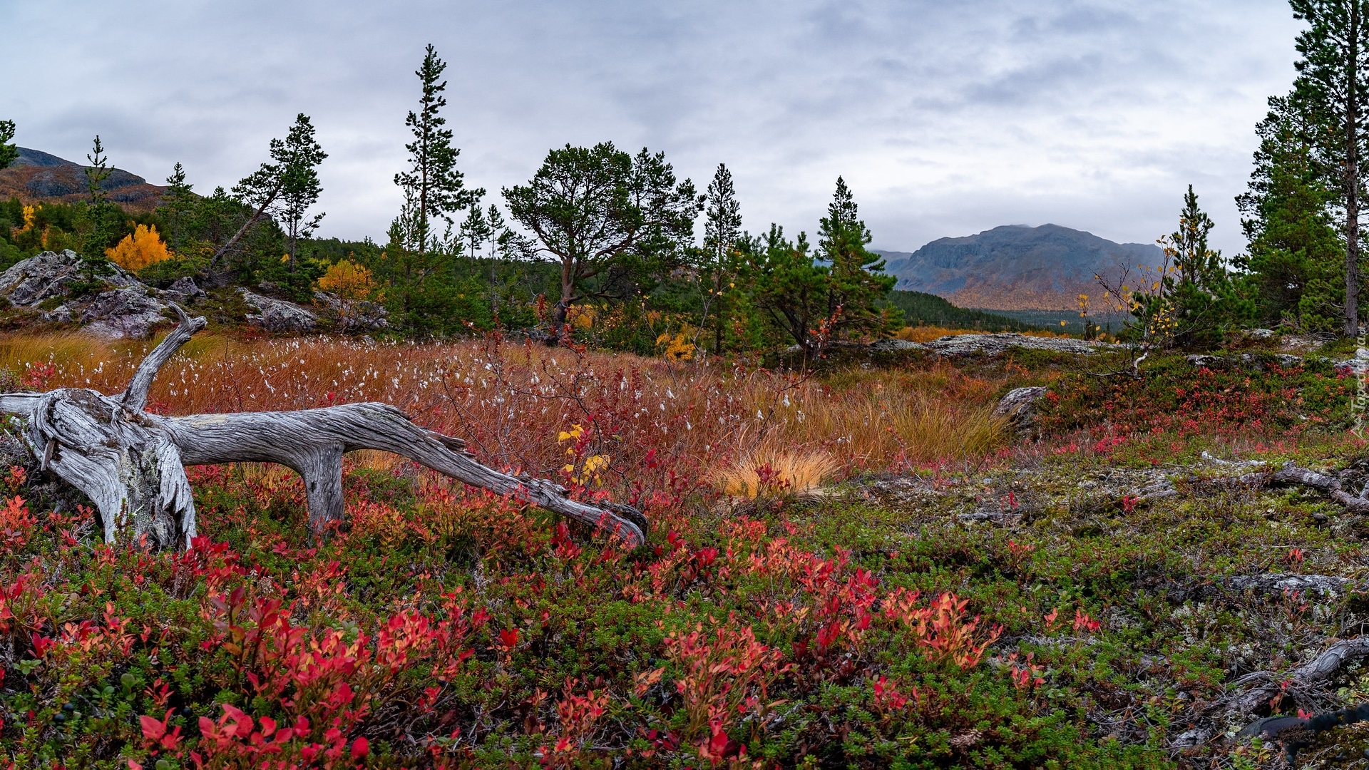 Edytor tapety: Suchy konar i kolorowa roślinność na tle gór