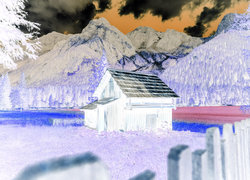 Edytor tapety: Ogrodzony domek na polanie z widokiem na góry
