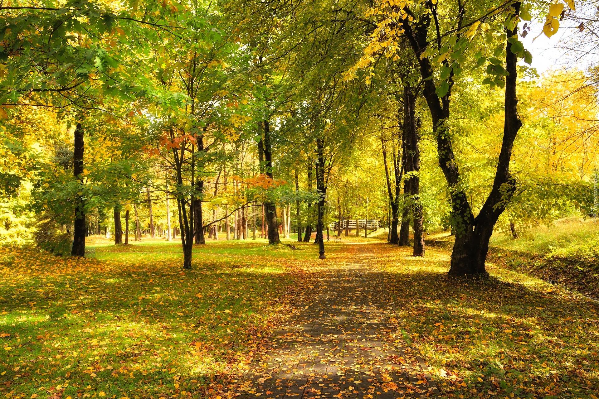 Edytor tapety: Rozświetlone jesienne drzewa w słonecznym parku
