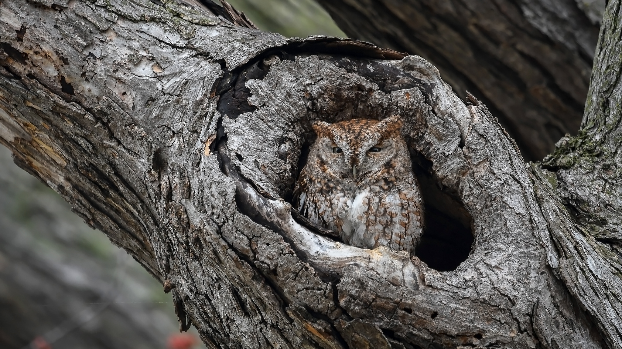 Edytor tapety: Syczoń krzykliwy w dziupli