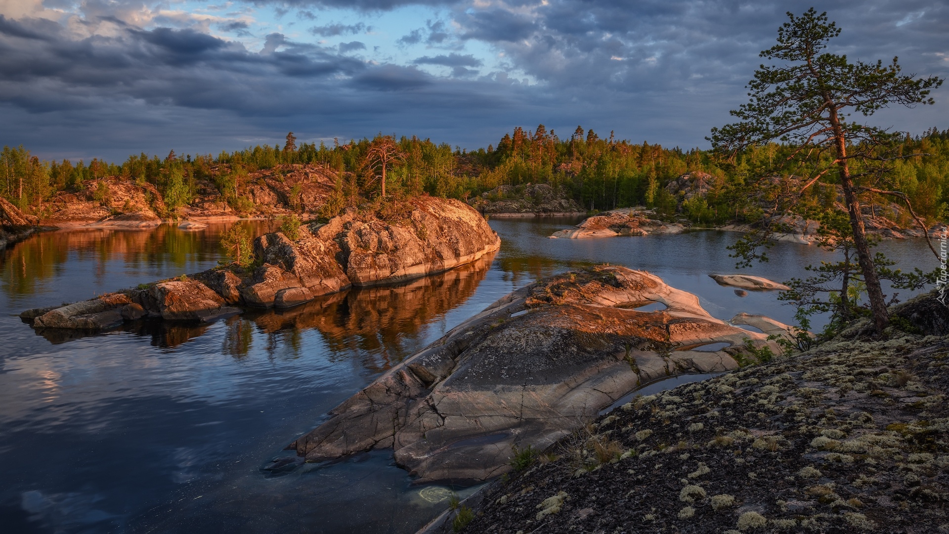 Edytor tapety: Chmury nad lasem i Jeziorem Ładoga