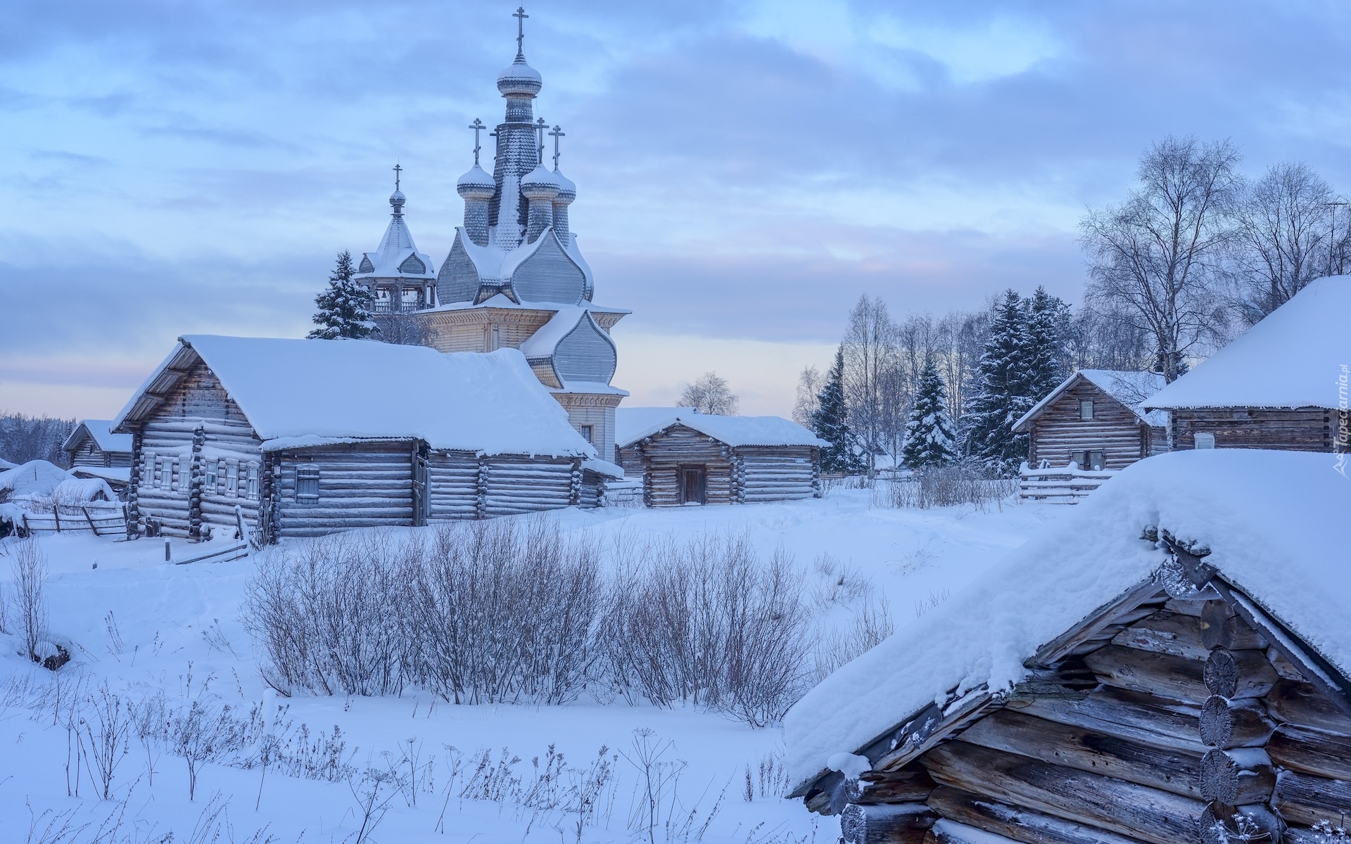 Edytor tapety: Ośnieżona cerkiew i domy w rosyjskiej wsi Kimzha