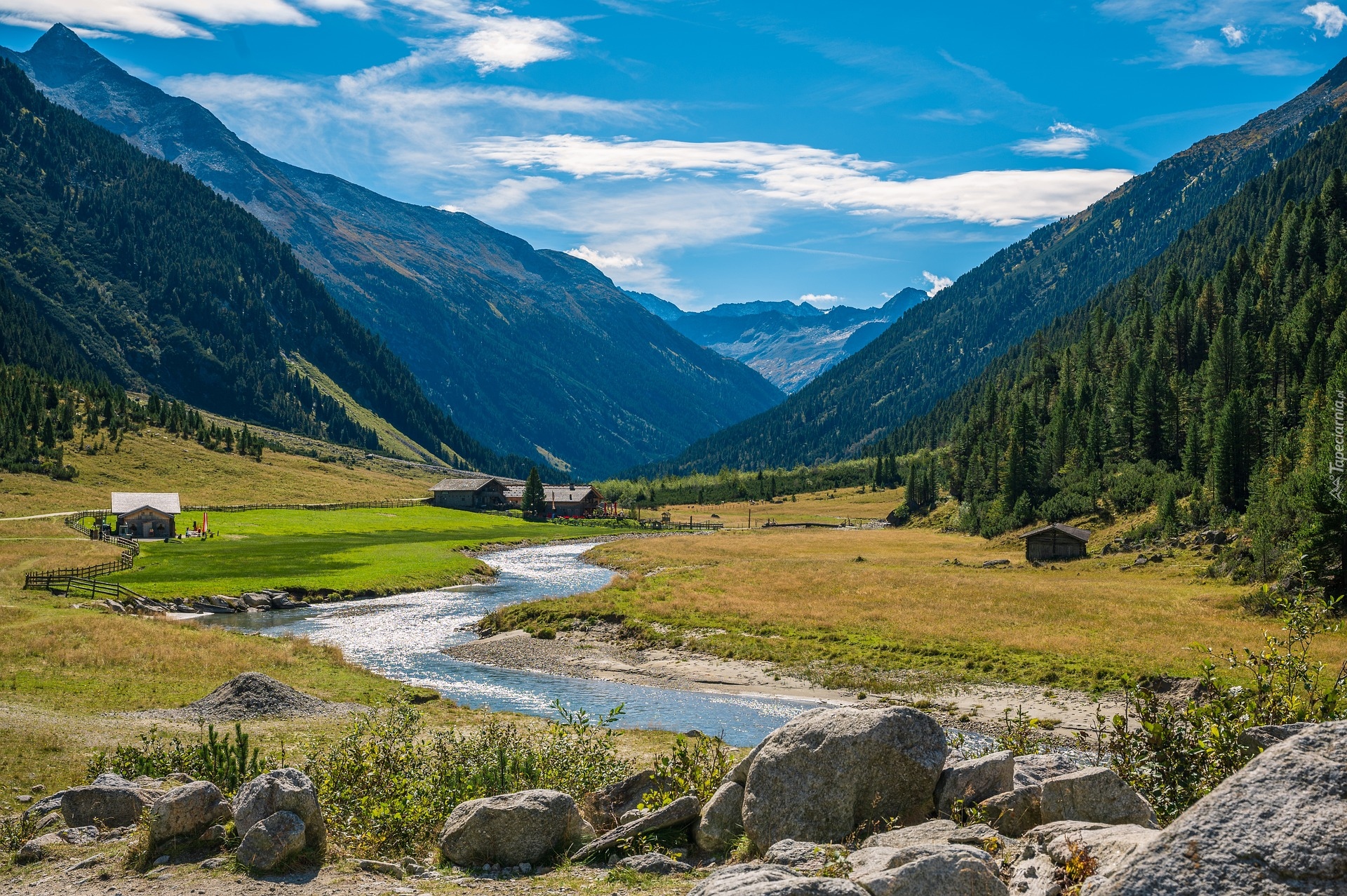 Edytor tapety: Domy nad rzeką w górskiej dolinie