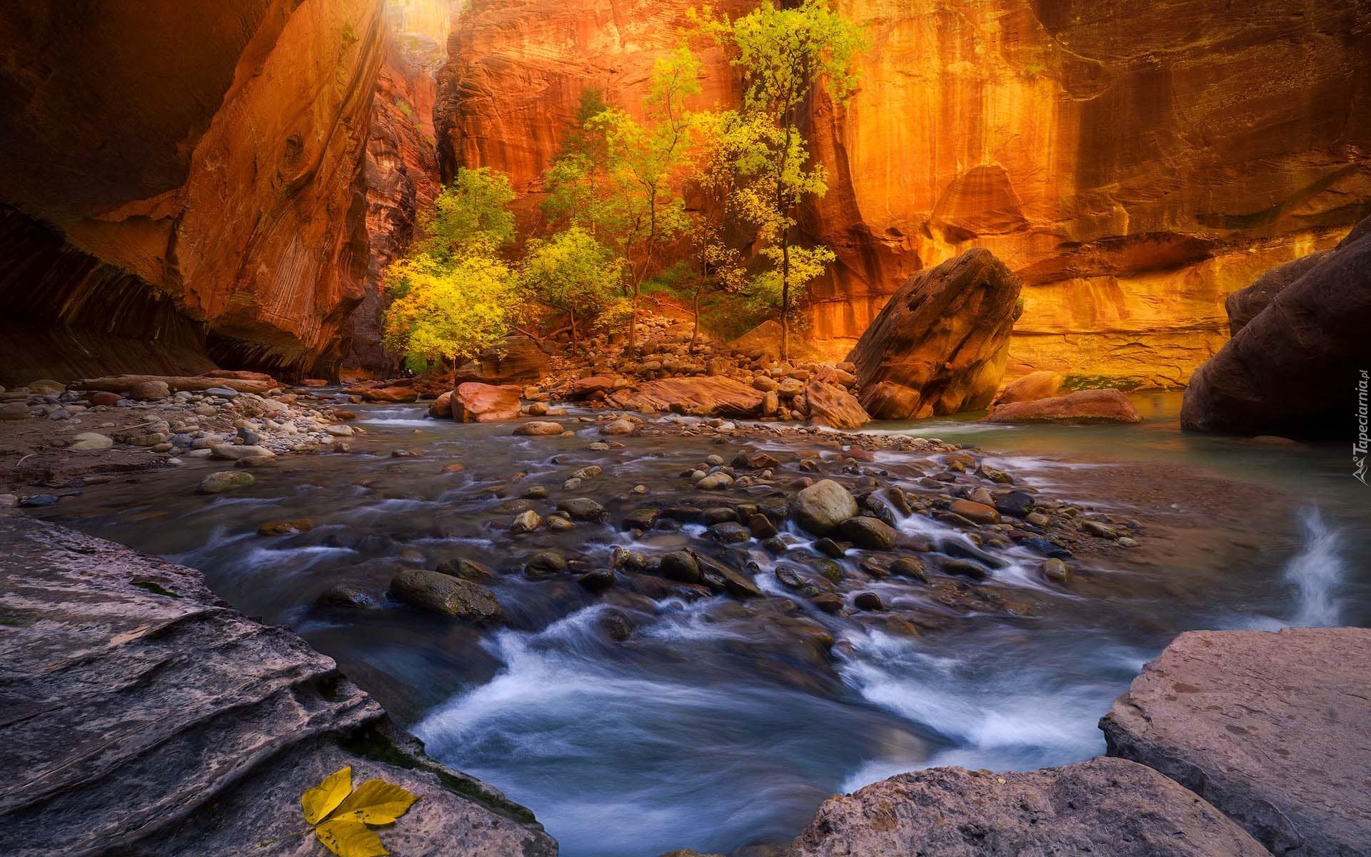 Edytor tapety: Drzewa przy skałach nad rzeką Virgin River