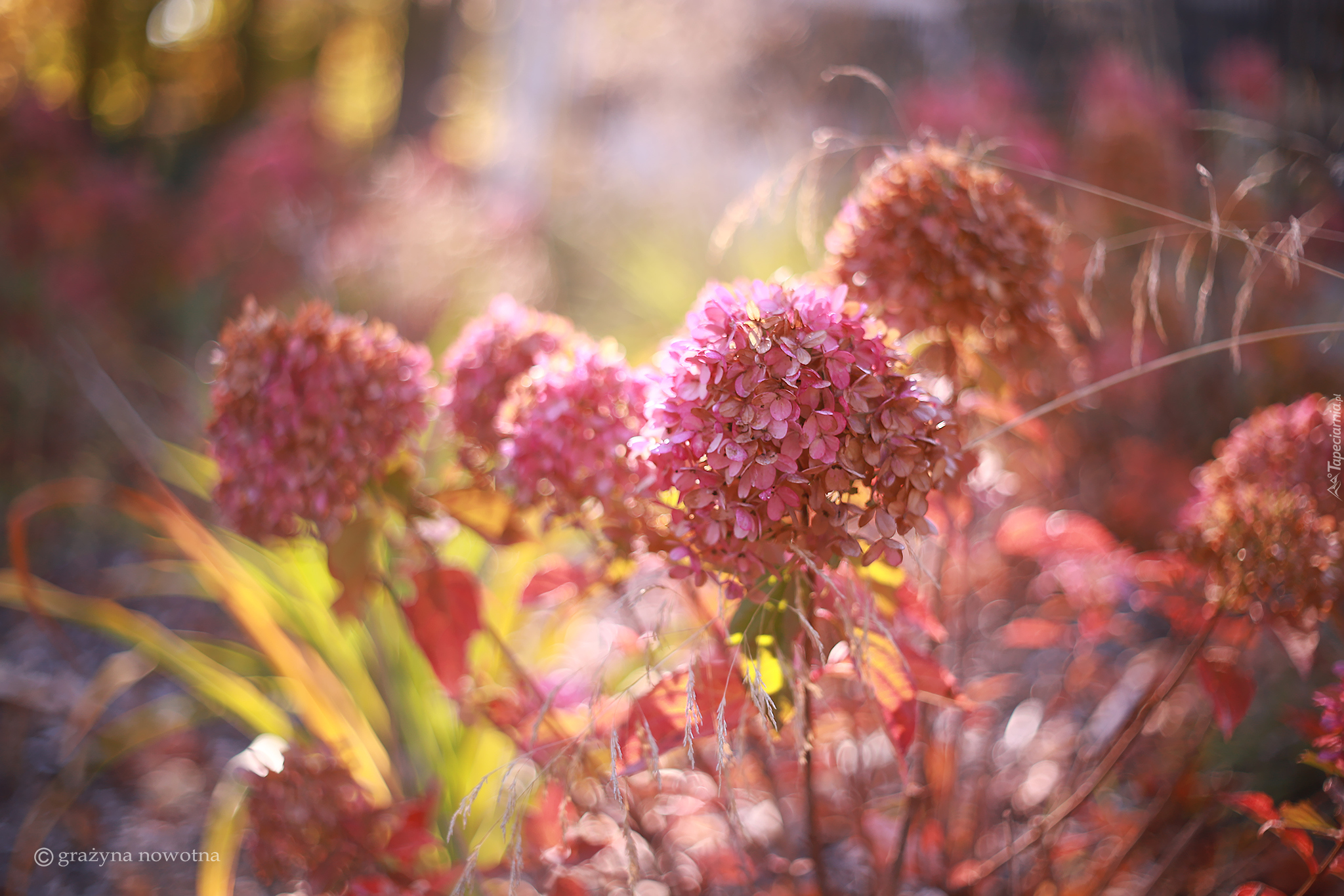 Edytor tapety: Rozświetlone słońcem różowe hortensje