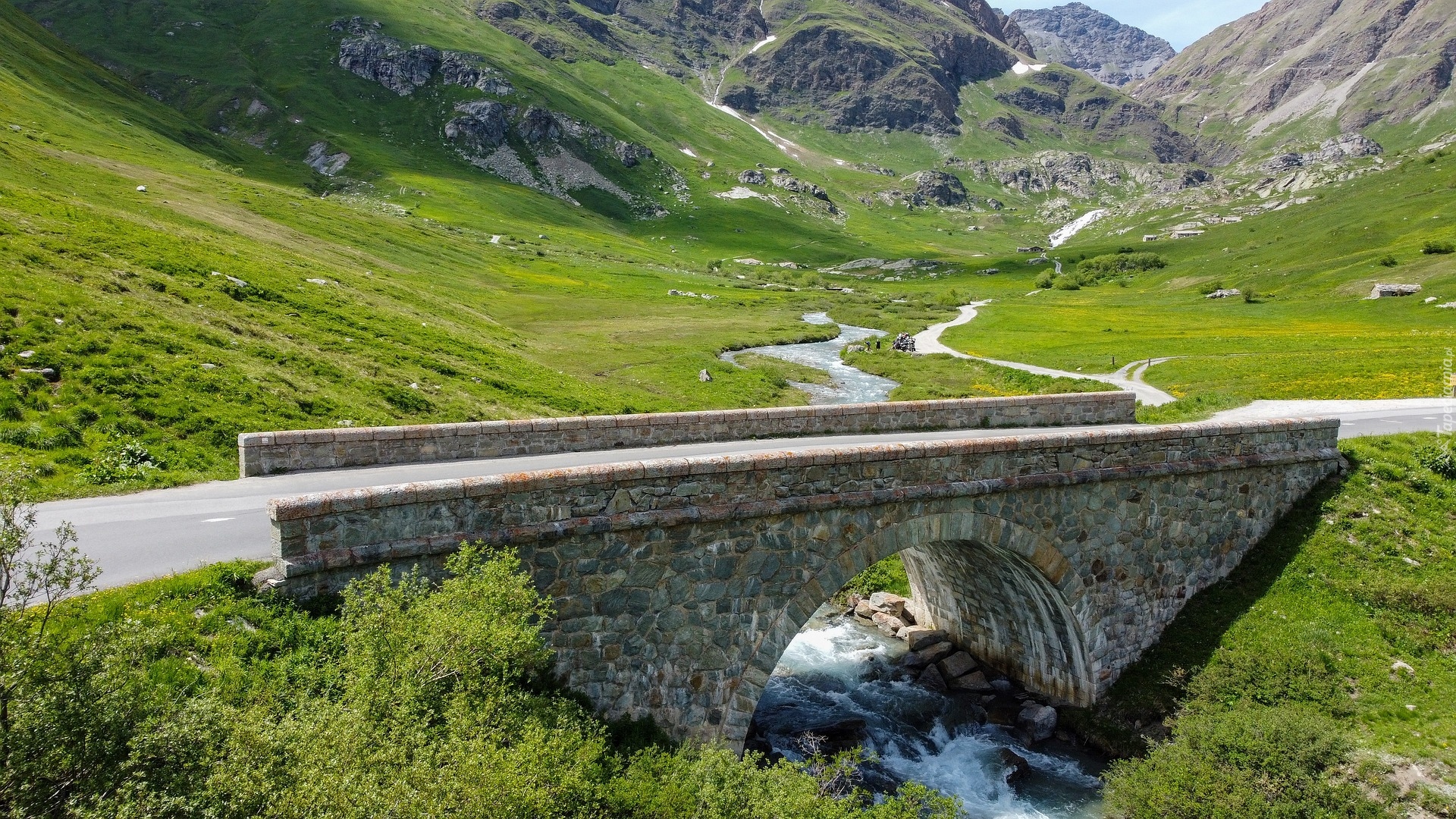 Edytor tapety: Kamienny most nad rzeką w górskiej dolinie