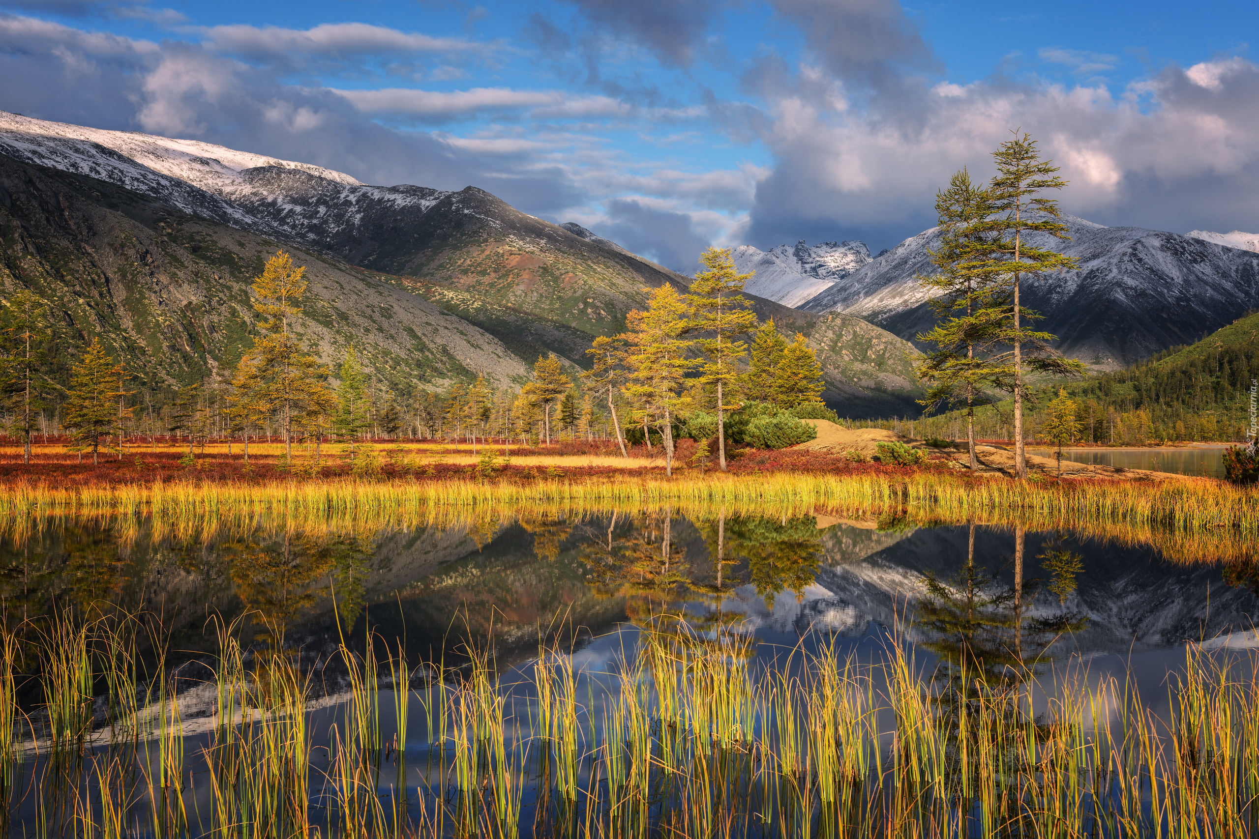 Edytor tapety: Jesienne drzewa i góry nad jeziorem w Kołymie