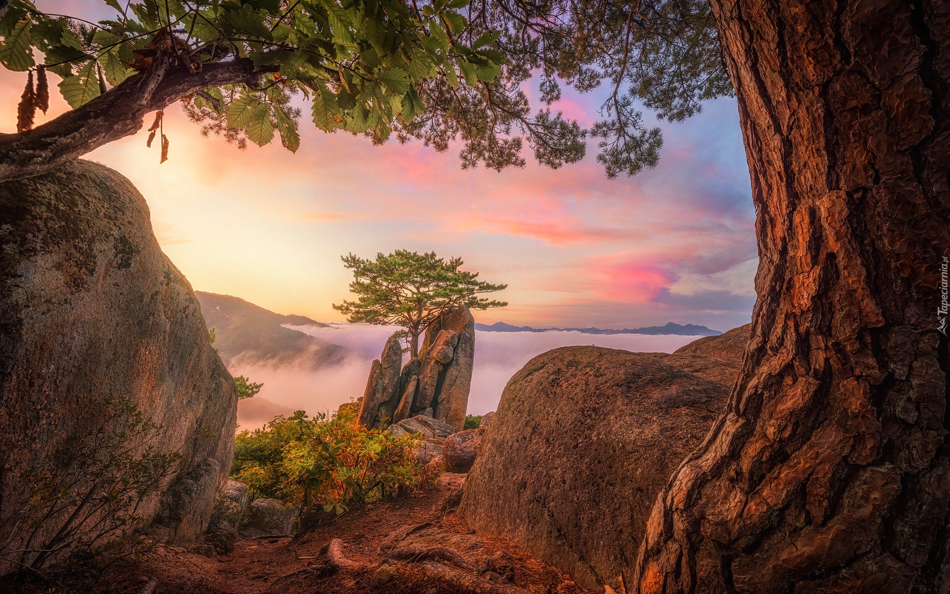 Edytor tapety: Skały obok sosny na tle zamglonych gór