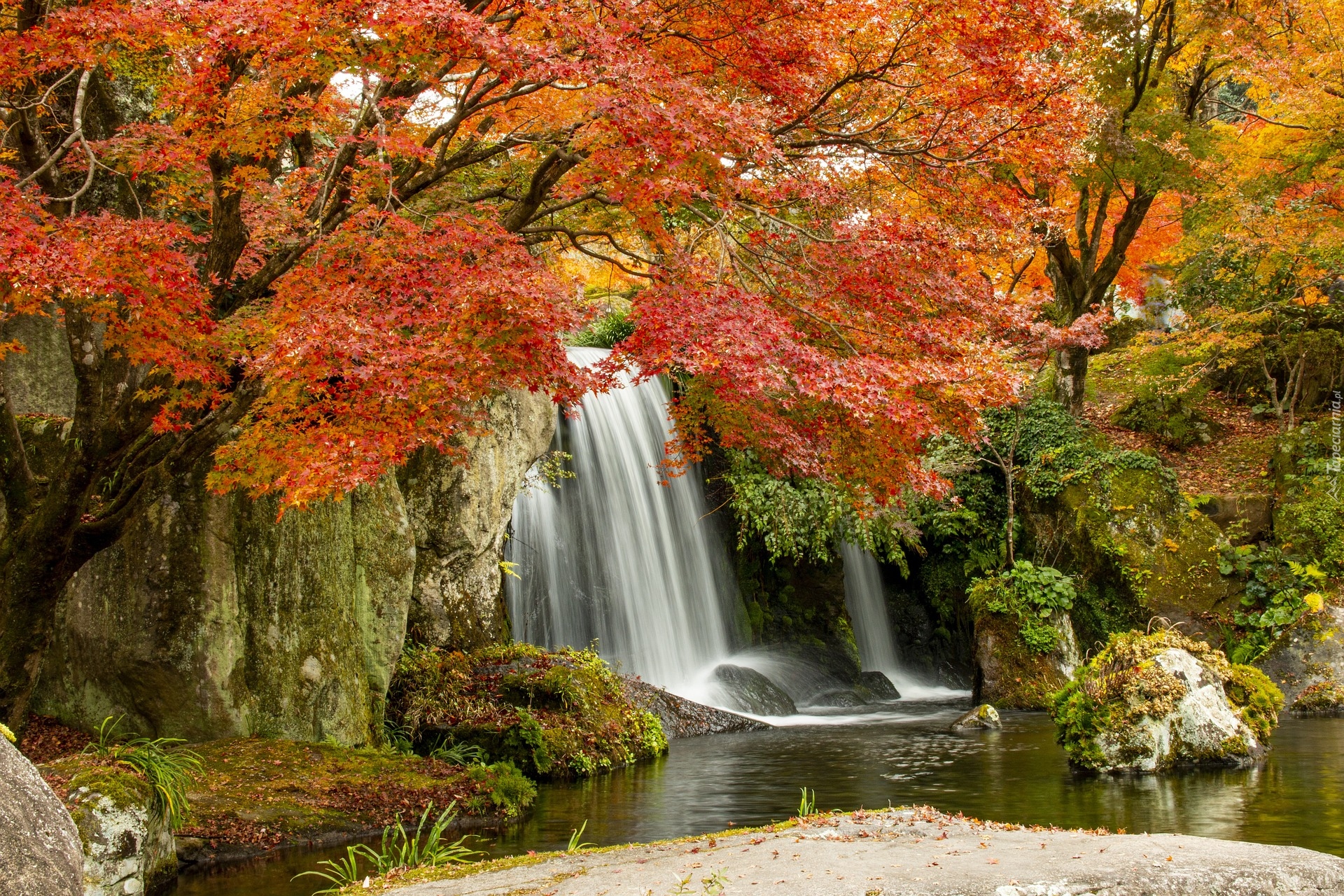Edytor tapety: Kolorowe jesienne drzewa przy wodospadzie wpadającym do rzeki