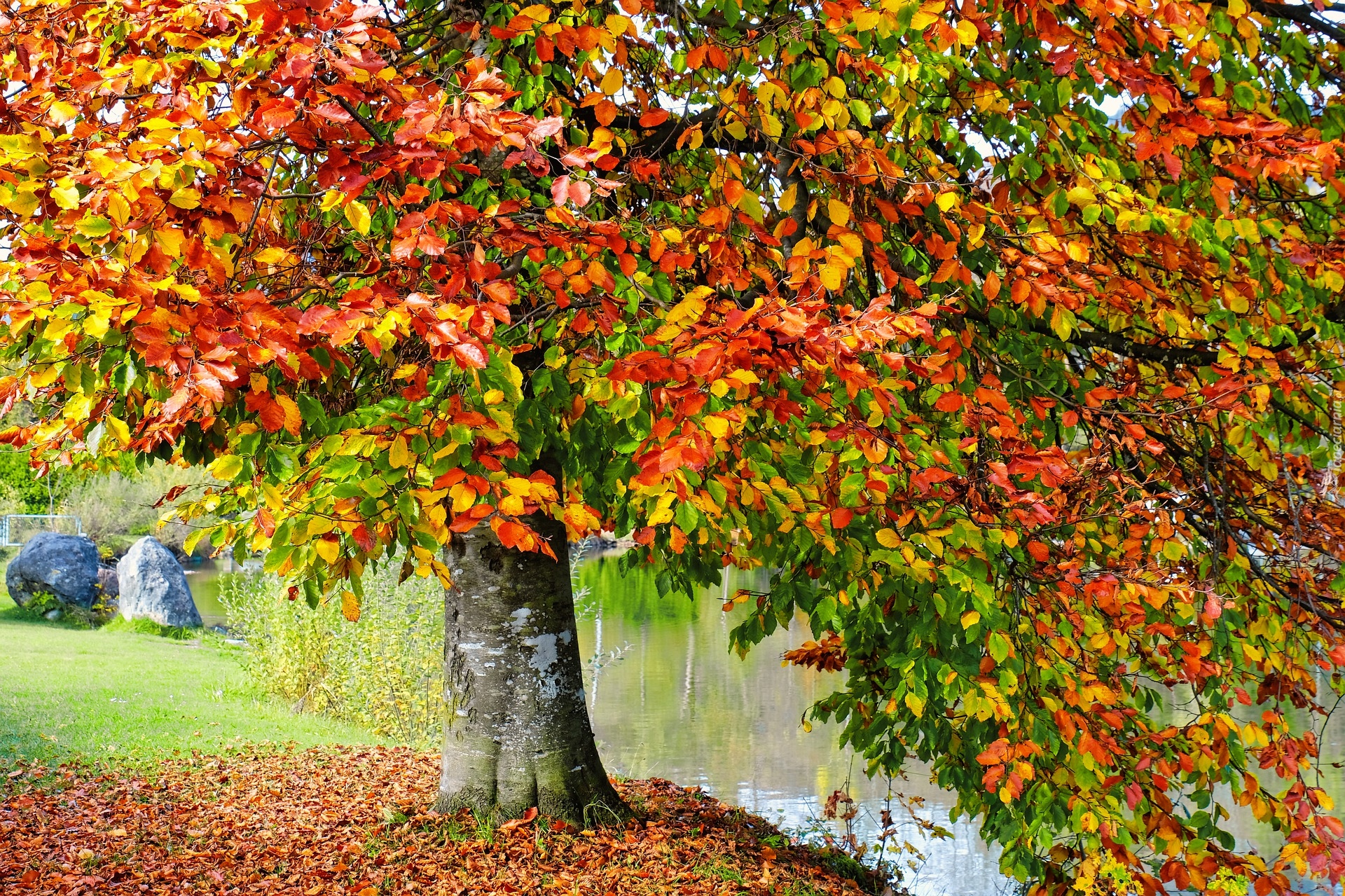 Edytor tapety: Buk z kolorowymi liśćmi nad rzeką