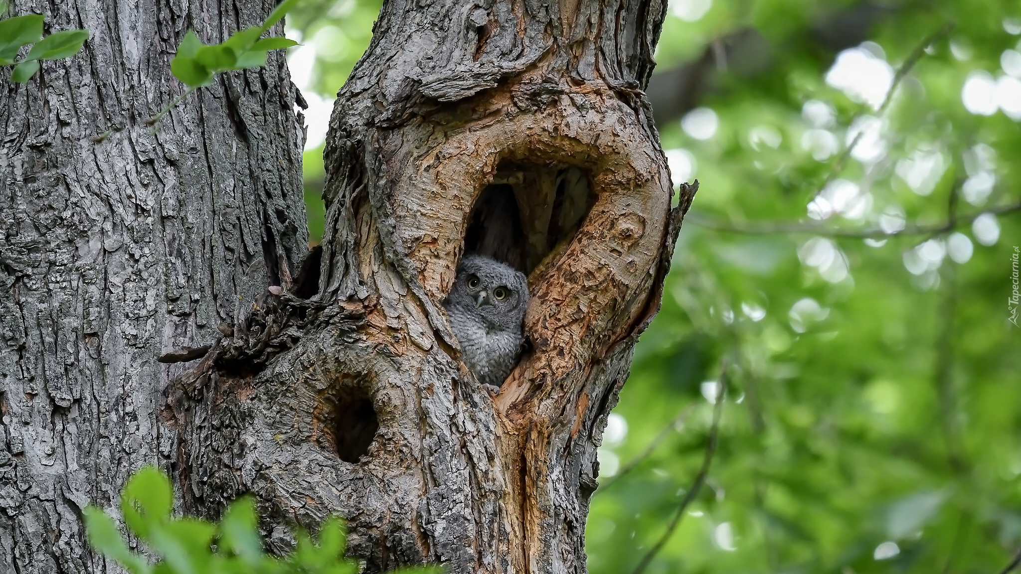 Edytor tapety: Syczoń krzykliwy zerkający z dziupli