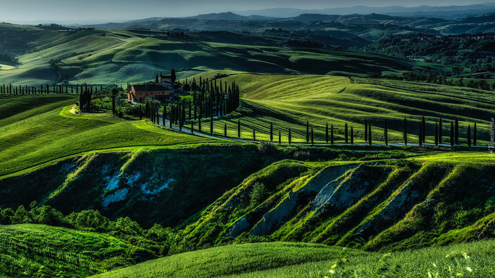 Edytor tapety: Cyprysy przy drodze na zielonych wzgórzach Toskanii