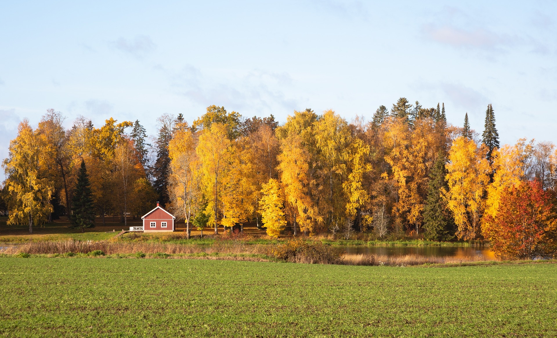 Edytor tapety: Dom i pożółkłe drzewa nad stawem