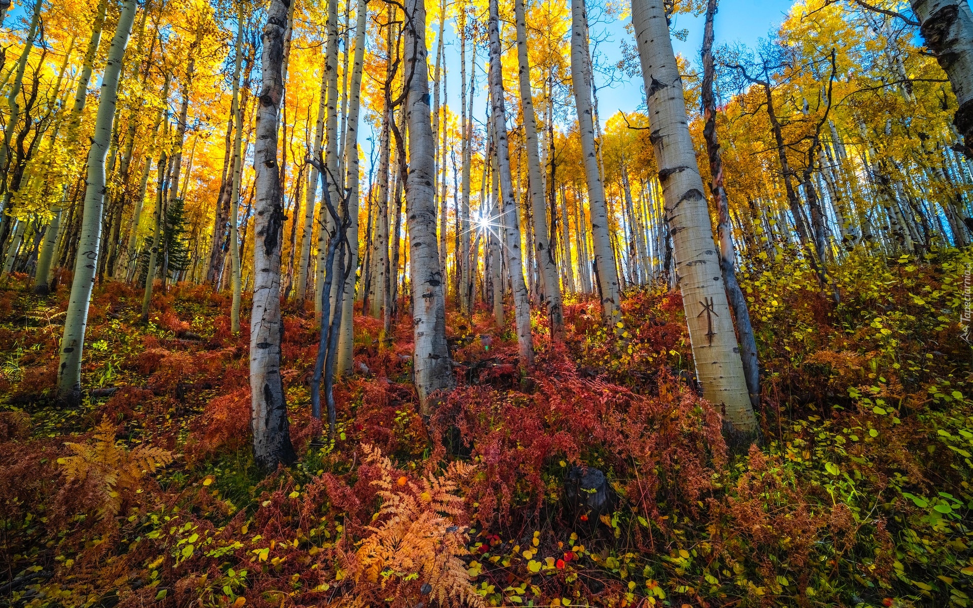 Edytor tapety: Paprocie i krzewy pod brzozami