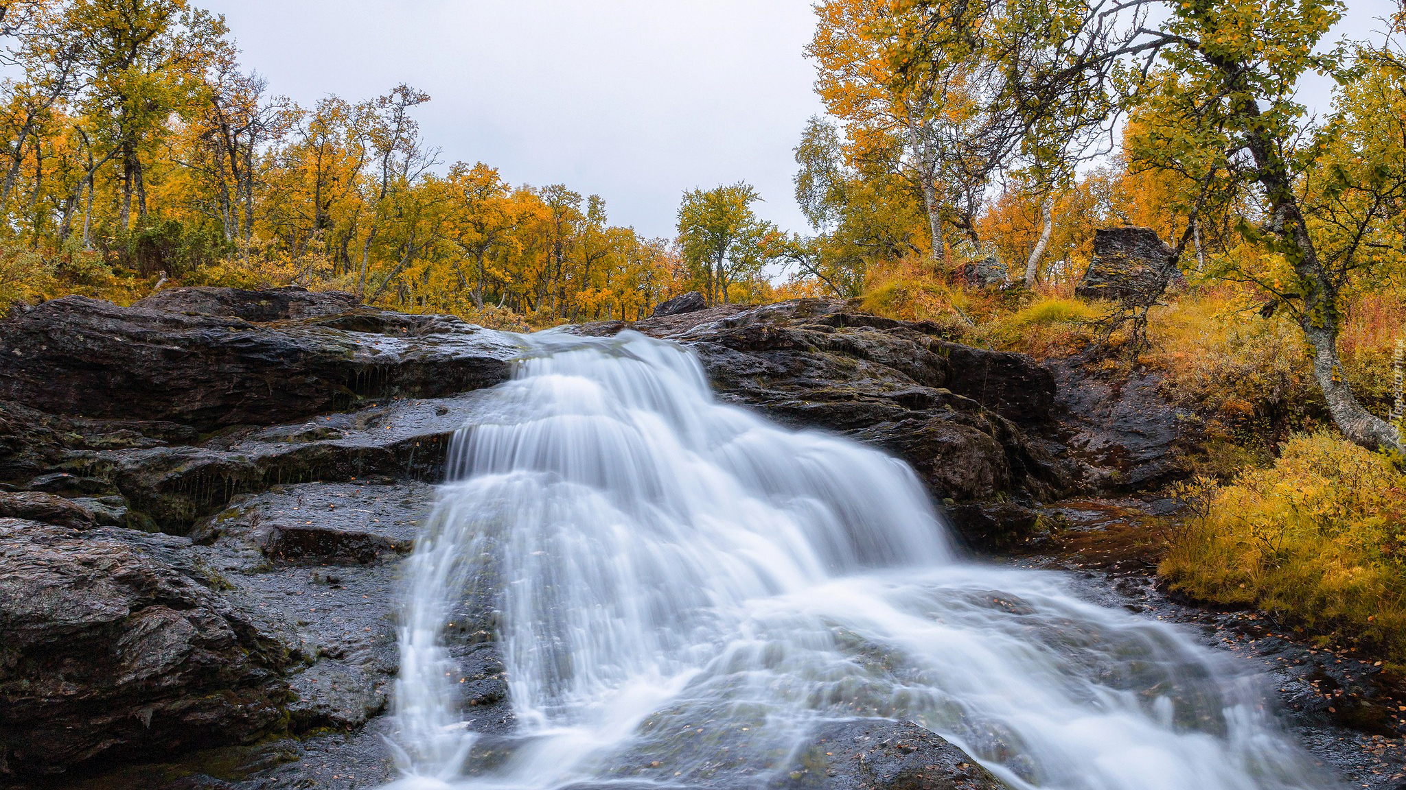 Edytor tapety: Pożółkłe drzewa przy wodospadzie