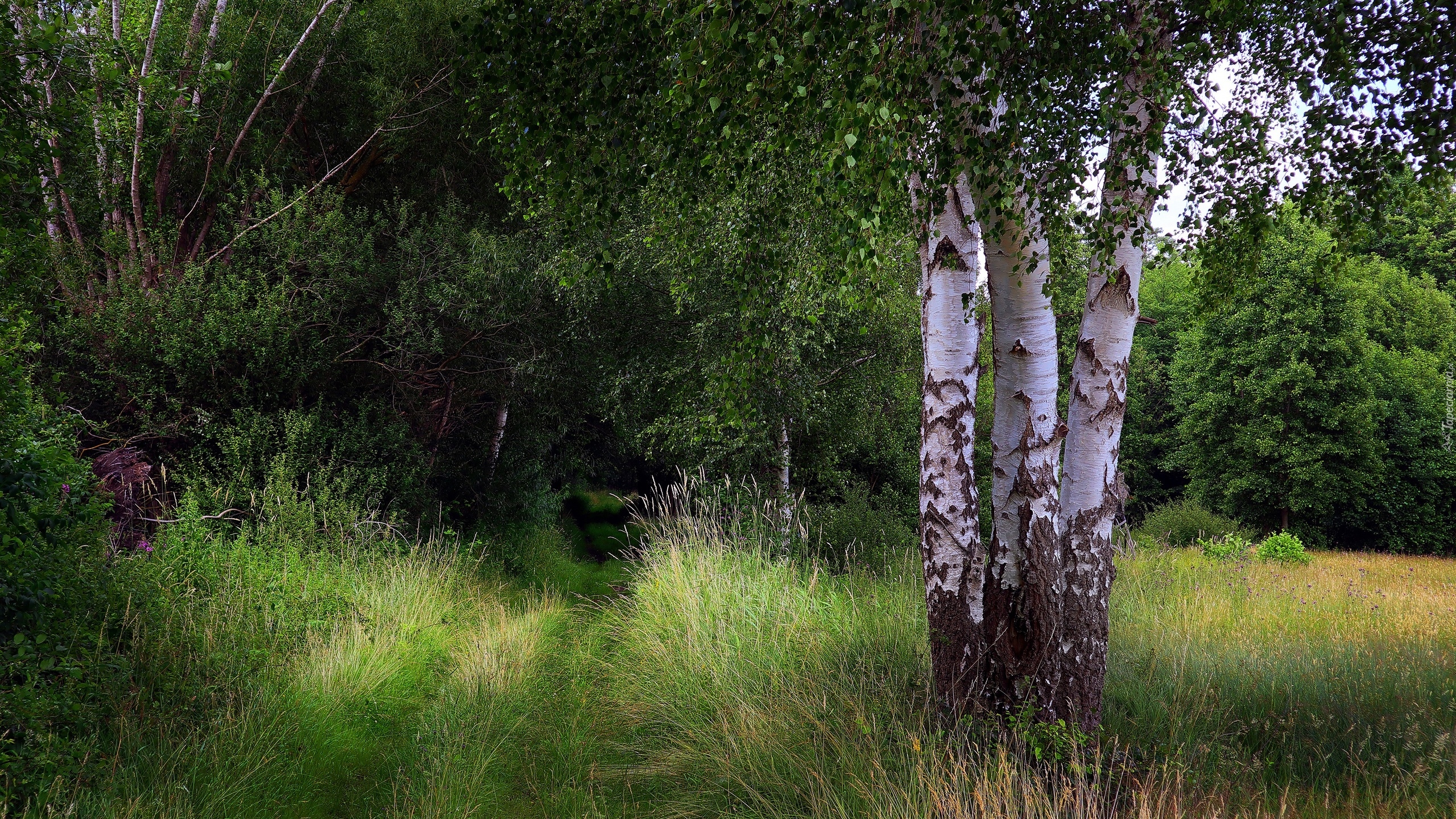 Edytor tapety: Brzozy przy ścieżce w zielonym lesie