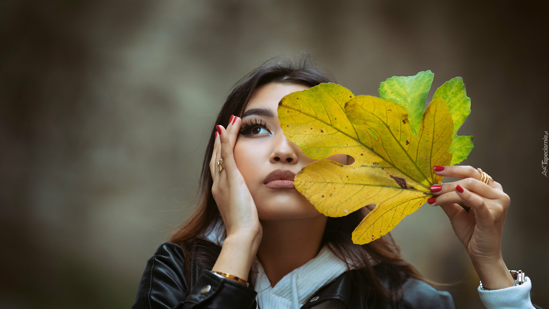 Edytor tapety: Kobieta z jesiennymi liśćmi przy twarzy