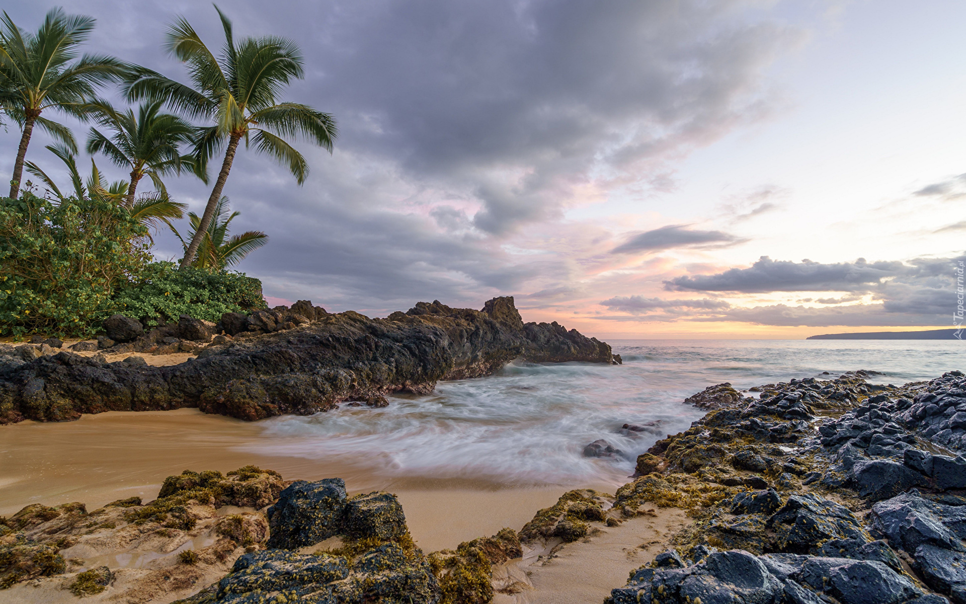 Edytor tapety: Palmy i skały na wybrzeżu morza