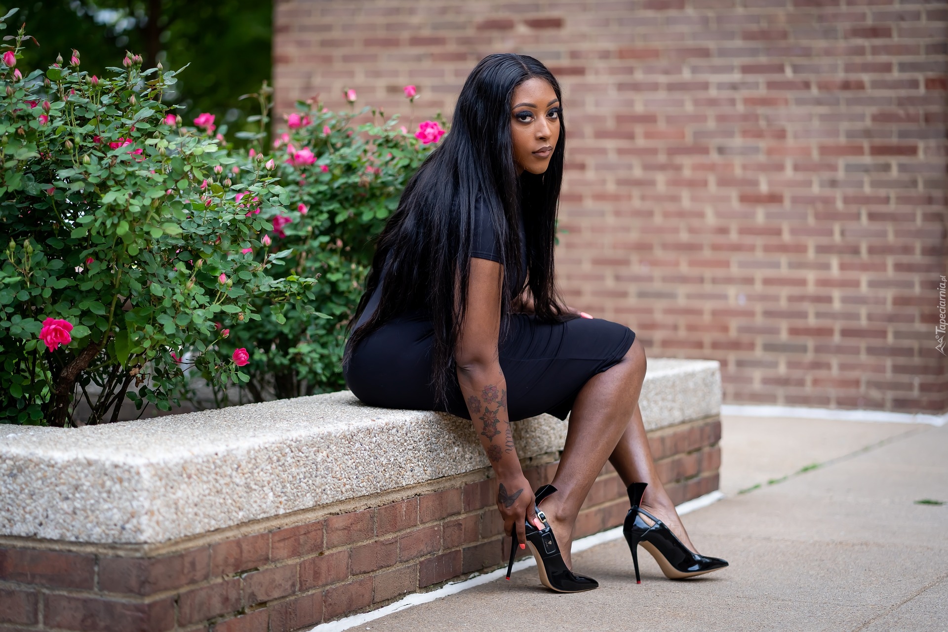 Edytor tapety: Długowłosa kobieta w czarnej sukience i szpilkach
